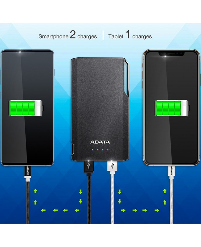 پاوربانک ای دیتا با ظرفیت 10000 میلی آمپر ساعت دارای قابلیت شارژ همزمان 2 دستگاه را دارد، همچنین در جعبه این محصول یک کابل تبدیل USB به microUSB جهت شارژ کردن شارژر همراه قرار داده شده است.