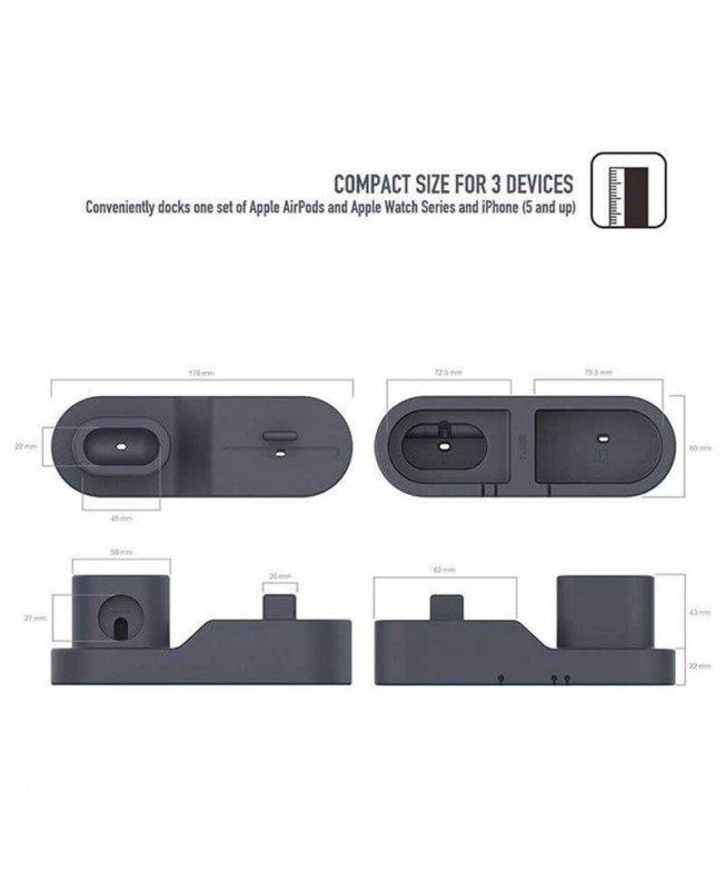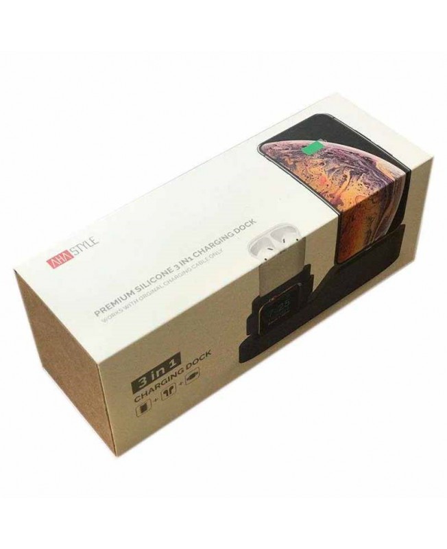 پایه شارژ Dock برند آها استایل برای نگهداری و شارژ iphone ، هندزفری اپل و iWatch طراحی شده است به این صورت که شما می توانید این پایه سیلیکونی را که از جنس پلاستیک نرم ساخته شده بر روی میز و یا یک سطح صاف قرار دهید و کابل های شارژ را از قسمت انتهایی به آن متصل کنید و سپس دیواس های خود را بر روی قسمت های موجود در پایه شارژ سه کاره آها استایل بگذارید تا شارژ شوند. ابعاد کوچک و طراحی فشرده این استند باعث شده تا بتوانید به راحتی از آن روی میز کار یا در خانه استفاده کنید و محدودیتی برای کار با آن در هیچ محیطی نداشته باشید. همچنین گوشی آیفون بر روی این استند به حالت عمودی قرار می گیرد و شما می توانند از آن در حالت ایستاده استفاده نمایید.