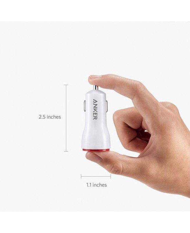 شارژر فندکی A2310 PowerDrive 2 برند انکر دارای قابلیت شارژر هم زمان دو دستگاه و تشخیص شدت جریان مورد نیاز دستگاهای متصل شده با ابعاد 28*28*65 میلیمتر و وزن 27 گرم است.