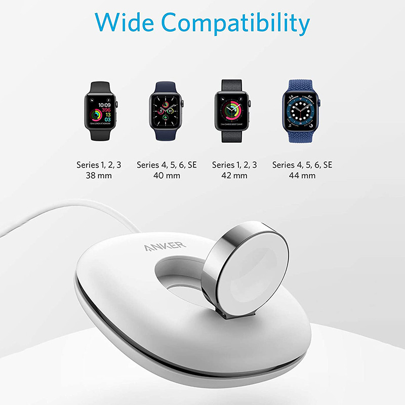 داک شارژ اپل واچ انکر مدل A8802 با تمامی سایز های اپل واچ از نسل 1 تا 6 سازگاری کامل دارد و به کاربران این اجازه را می دهد تا بتوانند به راحتی این داک وایرلس را به راحتی حمل و از آن استفاده نمایند.