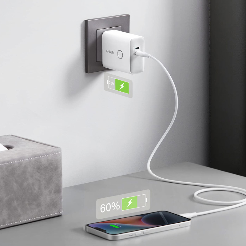 شارژر دیواری دو در یک A1626 برند انکر با ابعاد 71*59.5*31 میلی متر و وزن 210 گرم دارای دو پورت Type-c با حداکثر توان 45W و باتری لیتیوم پلیمری با ظرفیت 5000 میلی آمپر ساعت می باشد که می تواند به طور همزمان دو دستگاه را شارژ نمایید ،شارژر انکر 521 5000mAh دارای قابلیت شارژ سریع دو جهته PD3.0 ، توزیع برق هوشمند و سرعت شارژ با حداکثر توان 45 واتی است،این دستگاه هنگام متصل بودن به برق میتواند با قدرت توان 45w دستگاه شما را شارژ کند و در حالت متصل نبودن به برق نهایتا 30W به شما ارائه میدهد،از دیگر نکاتی که باید به آن اشاره کرد وجود دکمه پاور برای روشن و خاموش کردن دستگاه و نشانگر LED چهارتایی روی بدنه برای نمایش میزان شارژ باقی مانده و همچنین یک کابل شارژ و یک کیسه نگهداری شارژر در بسته بندی محصول اشاره کرد.
