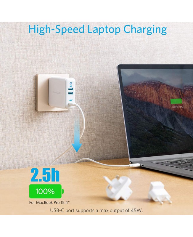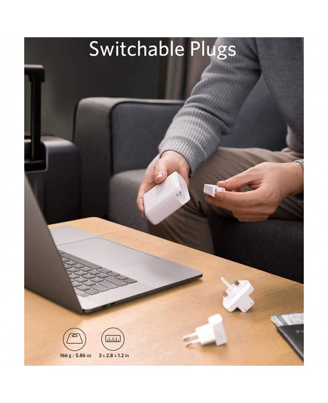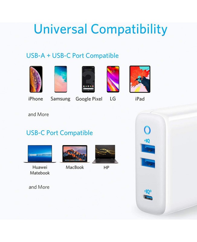 شارژر A2033 انکر با ابعاد 71*30*75 میلی متر و وزن 168 گرم دارای یک درگاه خروجی Type-c و دو درگاه USB برای شارژر دستگاه های دیگر با حداکثر توان 65 واتی می باشد که هر سه پورت آن دارای قابلیت Power IQ3.0 است با این تفاوت که پورت تایپ سی از شارژ PD نیز پشتیبانی می کند و به طور کلی این درگاه ها می توانند بسته به نیاز دستگاه شدت جریان و ولتاژ مورد نیاز را فراهم سازند؛ طراحی این محصول هم به گونه ای است که سری های ان قابلیت تعویض دارند و این امکان را برای کاربر فراهم می کند تا بتواند از این محصول در پریز های مختلف استفاده نماید. اگر به صورت کلی بخواهیم ویژگی های این شارژر دیواری را بیان کنیم باید بگوییم که علاوه بر قابلیت IQ و PD از قابلیت های VoltageBoost (تنظیم نوسانات ولتاژ) و MultiProtect (محافظت از دستگاه متصل در برابر نوسانات ولتاژ ، جریان و دما) پشتیبانی می کند که باعث شده تا این محصول بتواند علاوه بر کاربری در شارژ دستگاه ها از آنها نیز در برابر نوسانات جریان ، ولتاژ و اضافه بار محافظت کرده و به صورت شارژ سریع و بسته به شدت جریان مورد نیاز به دیوایس ها برق ارائه دهد . پورت USB این محصول با حداکثر توان 20 وات و پورت USB-C با حداکثر توان 45 وات می تواند دستگاه های مورد نیاز شما را با پشتیبانی از تکنولوژی Power IQ 3.0 در سریع ترین زمان ممکن شارژ نماید و با توجه به چیپستی که درون آن قرار داده شده، قابلیت تشخیص میزان ولتاژ و آمپر مورد نیاز دستگاهی که به آن متصل می کند را داراست و بر اساس آن گوشی ، تبلت و سایر لوازم جانبی را شارژ می کند.
