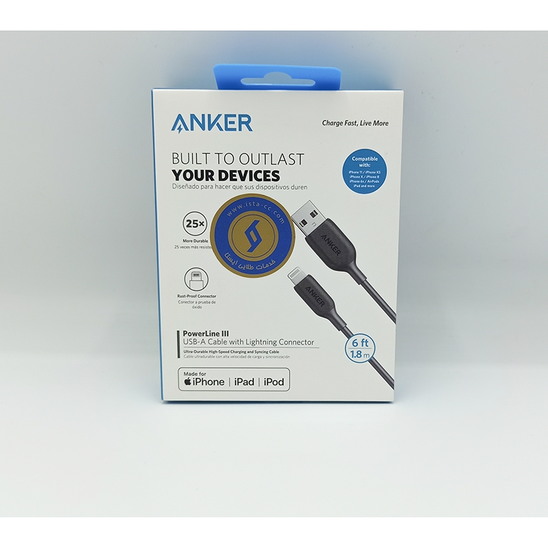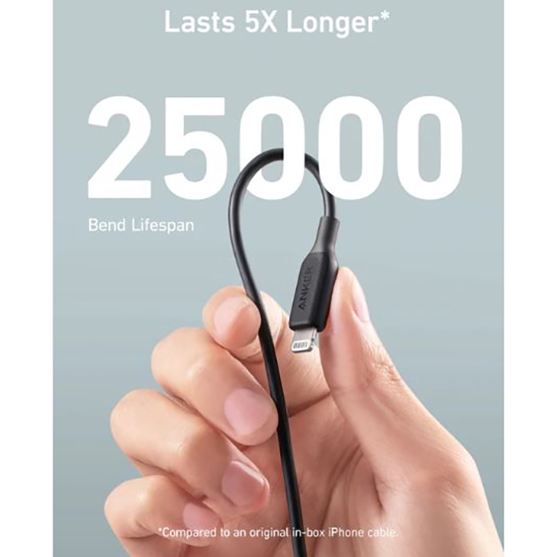 کابل USB-A به Lightning محصول برند انکر است که از محبوب ترین شرکت های تولید کننده لوازم جانبی به حساب می آید. طول این کابل 180 سانتی متر است و کابلی بلند به حساب می آید. این محصول علاوه بر اینکه کابلی مناسب برای شارژ دستگاه های دارای درگاه لایتنینگ می باشد، توانایی انتقال داده را نیز به این دستگاه های اپل می دهد. این کابل شارژ از استقامت بالایی برخوردار بوده و در برابر خمیدگی مقاومت مناسبی دارد به گونه ای که تا 25000 خمیدگی را تحمل می کند.