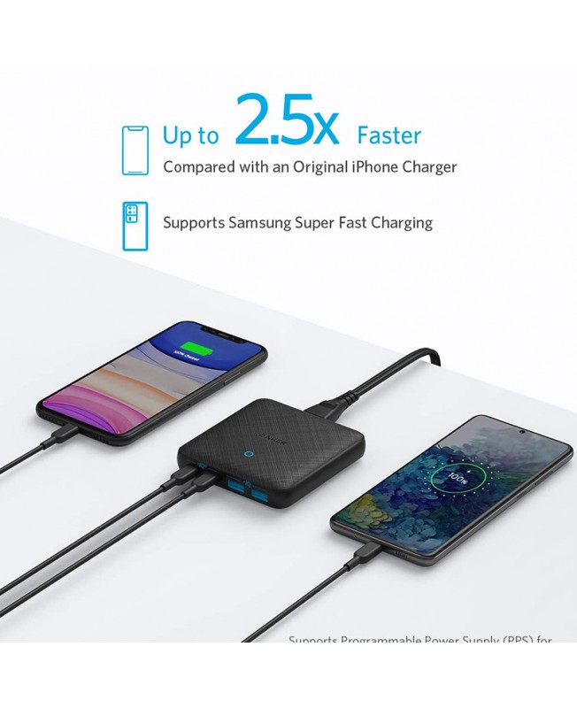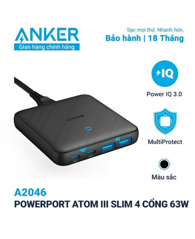 هاب A2046 برند انکر با ابعاد 20*86*90 میلی متر و وزن 136 گرم دارای 2 خروجی USB و 2 پورت Type-c می باشد که به کاربران این امکان را می دهد تا بتوانند با کابل موجود در بسته بندی این محصول را مستقیم به برق متصل کنند و از طرفی دیگر چهار دستگاه راه به طور همزمان با کمک پورت های تعبیه شده بر روی آن شارژ کرد ، درباره قابلیت های این هاب شارژ هم باید توجه داشته باشید که از ویژگی Power IQ 3.0 برای شارژ سریع ، VoltageBoost برای تشخیص مقاومت کابل و MultiProtect که از دستگاه های متصل به این هاب در برابر نوسانات ولـتاژ ، دما و جریان محافظت می کند.توان این محصول انکر هم در مجموع 63 وات می باشد که پورت های Type-c آن به تنهایی توانایی ارائه توان خروجی 45W را داراست.در آخر هم به این نکته توجه داشته باشید که این محصول توانایی شارژ دستگاه های آیفون تا 2.5 برابر سریع تر از شارژ های دیگر و پشتیبانی از سوپر فست شارژ سامسونگ را دارد.