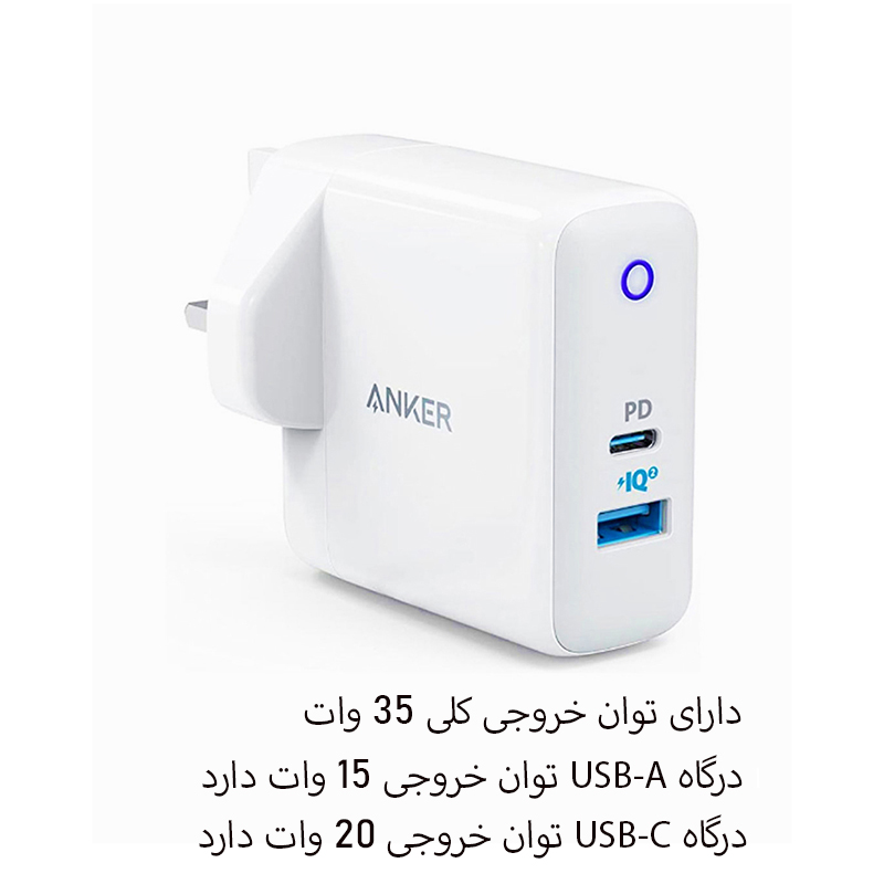 آداپتور انکر که دارای حداکثر توان خروجی 35 وات می باشد، شارژری دیواری قدرتمند می باشد که توانایی شارژ سریع دارد و دارای دو درگاه خروجی USB-C و USB-A می باشد که می توان دو دستگاه را به طور همزمان توسط آن شارژ کرد.