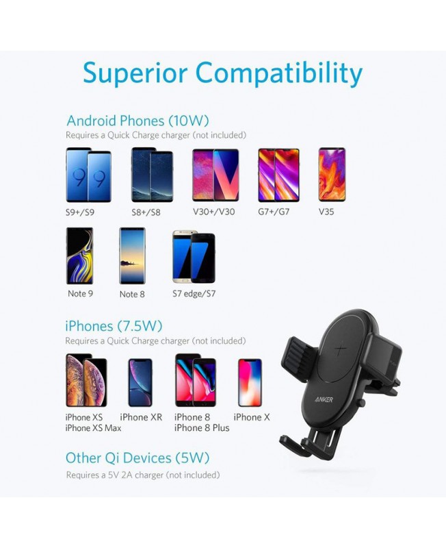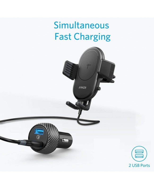 پایه نگهدارنده B2551 برند انکر علاوه بر بهره مندی از یک هولدر شارژر وایرلس دار با توانایی چرخش 360 درجه دارای یک فندکی دو پورت با پشتیبانی از شارژ سریع QC3.0 می باشد و کاربران می توانند دستگاه ایی با صفحه نمایش 4 تا 6 اینچ را به راحتی بر روی آن قرار دهند ، نحوه نصب و استفاده این محصول هم به این صورت می باشد که باید پایه گیره ای آن را به دریچه کولر خود متصل کرده و قسمت هولدر آن را نیز به کمک مهره پشتی به آن بچسبانید و با کمک دکمه کناری نگهدارنده و پیچ تنظیم موجود در پشت آن گوشی تلفن همراه را بر روی آن فیکس کنید ، سپس می توانید با استفاده از کابل microUSB و فندکی قرار داده شده در بسته بندی از شارژ بی سیم آن لذت ببرید؛ به صورت کلی اگر بخواهیم به توضیح مشخصات این محصول کمپانی انکر بپردازیم باید گفت که یک پک و مجموعه کامل برای شارژ گوشی موبایل در خودرو می باشد و می تواند گوشی هایی با قابلیت شارژ وایرلس را با توان 5 ، 7.5 و نهایتا 10 وات شارژ نماید ، البته یک پورت شارژر فندکی هم علاوه بر شارژ بی سیم در اختیار کاربران قرار می گیرد که تمامی درگاه های خروجی از شارژ ایمن و سریع پشتیبانی می کنند.