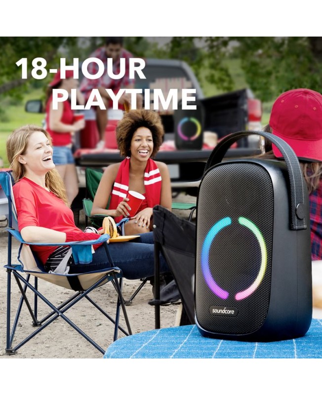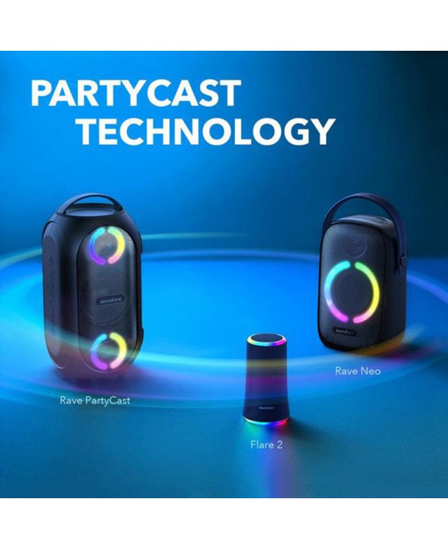 اسپیکر بلوتوثی انکر Rave Neo با 18 ساعت زمان پخش و رقص نور هوشمند و زیبا اسپیکری مناسب برای فضای خارج از خانه با توان خروجی 50 وات می باشد که با وجود گواهی استاندارد IPX7 کارایی خود را دو چندان کرده است.