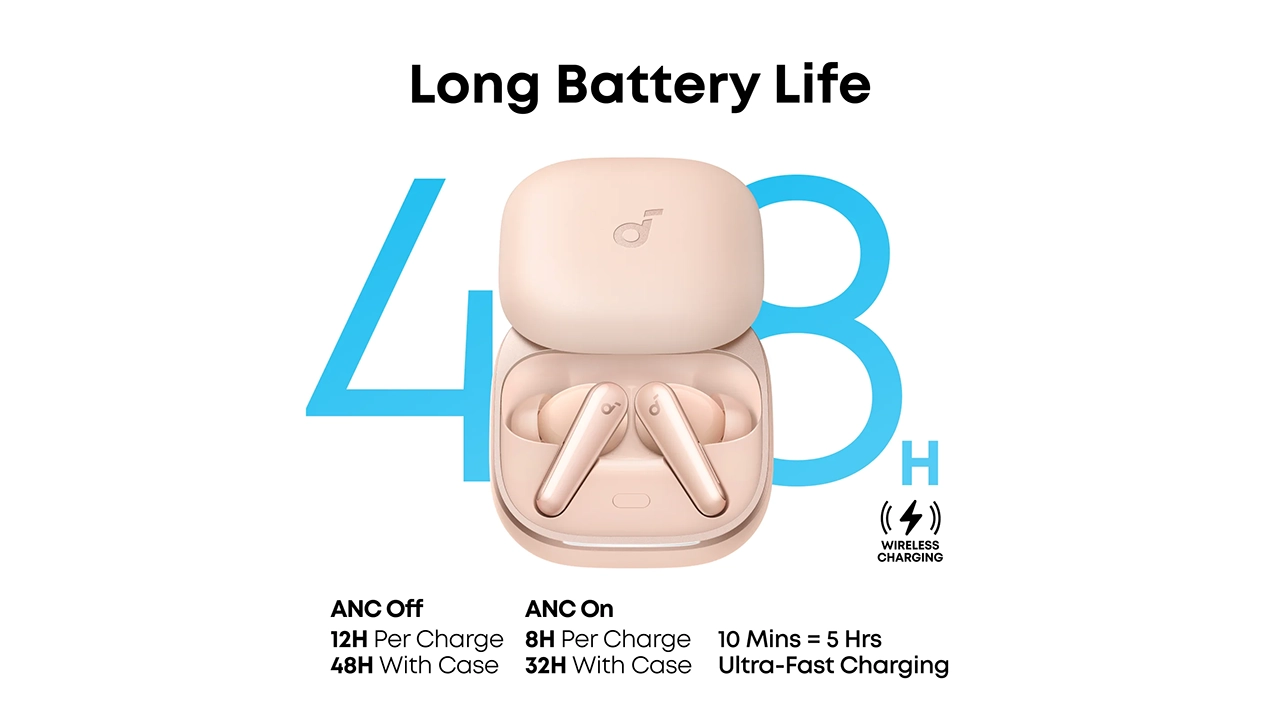 این محصول در زمینه شارژ و دوام باتری عملکردی چشمگیر دارد به طوری که با خاموش بودن ANC، هر ایرباد تا ۱۲ ساعت شارژدهی و به کمک کیس تا ۴۸ ساعت شارژ دهی دارد. همچنین در حالت فعال بودن ANC نیز همچنان عملکردی قابلقبول ارائه میدهد که عمر باتری به حدود ۸ ساعت استفاده مداوم با ایربادها و در مجموع ۳۲ ساعت همراه با کیس می رسد. یکی از ویژگیهای جذاب این مدل، فناوری شارژ سریع است؛ بهطوریکه تنها با ۱۰ دقیقه شارژ میتوانید تا ۵ ساعت موسیقی بدون وقفه گوش دهید. این قابلیت برای زمانهایی که عجله دارید یا فراموش کردهاید هدفون را شارژ کنید، بسیار کاربردی خواهد بود.