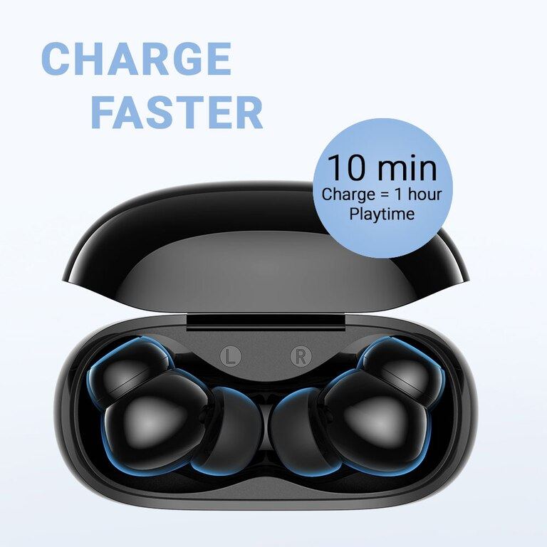هندزفری بلوتوثی Soundcore R100 محصول برند انکر می باشد که امروزه به دلیل ارائه کالاهای با کیفیت محبوبیت بالایی دارد می باشد. این هدفون این امکان را می دهد که بعد از شارژ شدن کامل آن تا 6.5 ساعت موسیقی گوش کنید البته این نکته حائز اهمیت است که کیس آن که هدفون درون آن قرار می گیرد در صورت شارژ شدن به صورت کامل می تواند تا 25 ساعت پخش موسیقی را برای کاربران به ارمغان بیاورد. این محصول دارای 2 میکروفون می باشد که جزو ویژگی های خاص آن است زیرا باعث می شود که کیفیت صدا در هنگام برقراری تماس بهتر باشد. نکته منحصر به فرد دیگر این هدفون بی سیم آن است که دارای استاندارد ضد اب IPX5 می باشد که مقاومت مناسبی را در برابر پاشش مستقیم آب ایجاد می کند. این هندزفری بی سیم به صورت بلوتوثی به دستگاه های شما متصل می شود و از بلوتوث نسخه 5.0 پشتیبانی می کند. در جعبه این کالا علاوه بر دفترچه راهنما کابلی مخصوص شارژ کردن این هدزفری وایرلس وجود دارد که USB به USB-C می باشد و همین طور سری های کوچک، متوسط و بزرگ که متناسب با گوش خود می توانید از آن ها استفاده کنید نیز وجود دارد.
