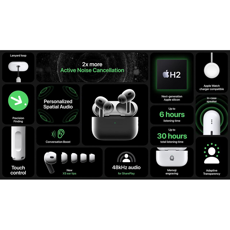 طبق ادعای کمپانی اپل ایرپادز 2 پرو تا 2 برابر بهتر از ایرپاد پرو نسل قبل نویز کنسلینگ قوی تری داشته و AirPods 2 Pro از دو میکروفون (یک میکروفون رو به بیرون و یک میکروفون رو به داخل) برای حذف صدای مزاحم محیط استفاده می کند. و همچنین قابلیت ANC آن با تطبیق مداوم با هندسه گوش و تناسب نوک گوش، محیط را ساکت میکند تا شما به طور کامل از موسیقی، پادکستها و تماسهایتان لذت ببرید.