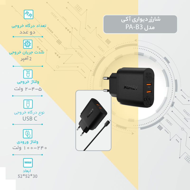 وال دیواری اکی با ابعاد 30*52*52 میلی متر و وزن 107 گرم دارای حداکثر توان 65 واتی به همراه دو درگاه خروجی USB-C و USB می باشد که این توانایی را به این محصول داده تا بتواند هر دستگاهی که به آن متصل می شود را در سریع ترین زمان ممکن و با تشخیص شدت جریان و ولتاژ مورد نیاز شارژ نماید، البته ولتاژ ورودی آداپتور شارژ PA-B3 آکی هم 100 تا 240 ولت با فرکانس 50/60 هرتز می باشد و همچنین به دلیل پشتیبانی از شدت جریان و ولتاژ خروجی 5V/2.4A (حداکثر توان خرجی 12 وات) در پورت USB و شدت جریان و ولتاژ خروجی 5V/2.4A, 9V/2.22A, 12V/1.67A ,15V/3A,20V/3.25 (حداکثر خروجی 65W Power Delivery 3.0) در پورت تایپ سی این امکان را فراهم می ساز تا بتوان علاوه بر شارژ گوشیهای موبایل ، تبلت ، موزیک پلیر و آیپد را هم داشت؛در آخر هم باید به این موضوع توجه داشته باشید که از این محصول برند آکی به دلیل بهره مندی از شارژ 65 وات پاور دلیوری می توان برای شارژ آیفون 12 و 13 بدون وجود هیچ مشکلی استفاده کرد.