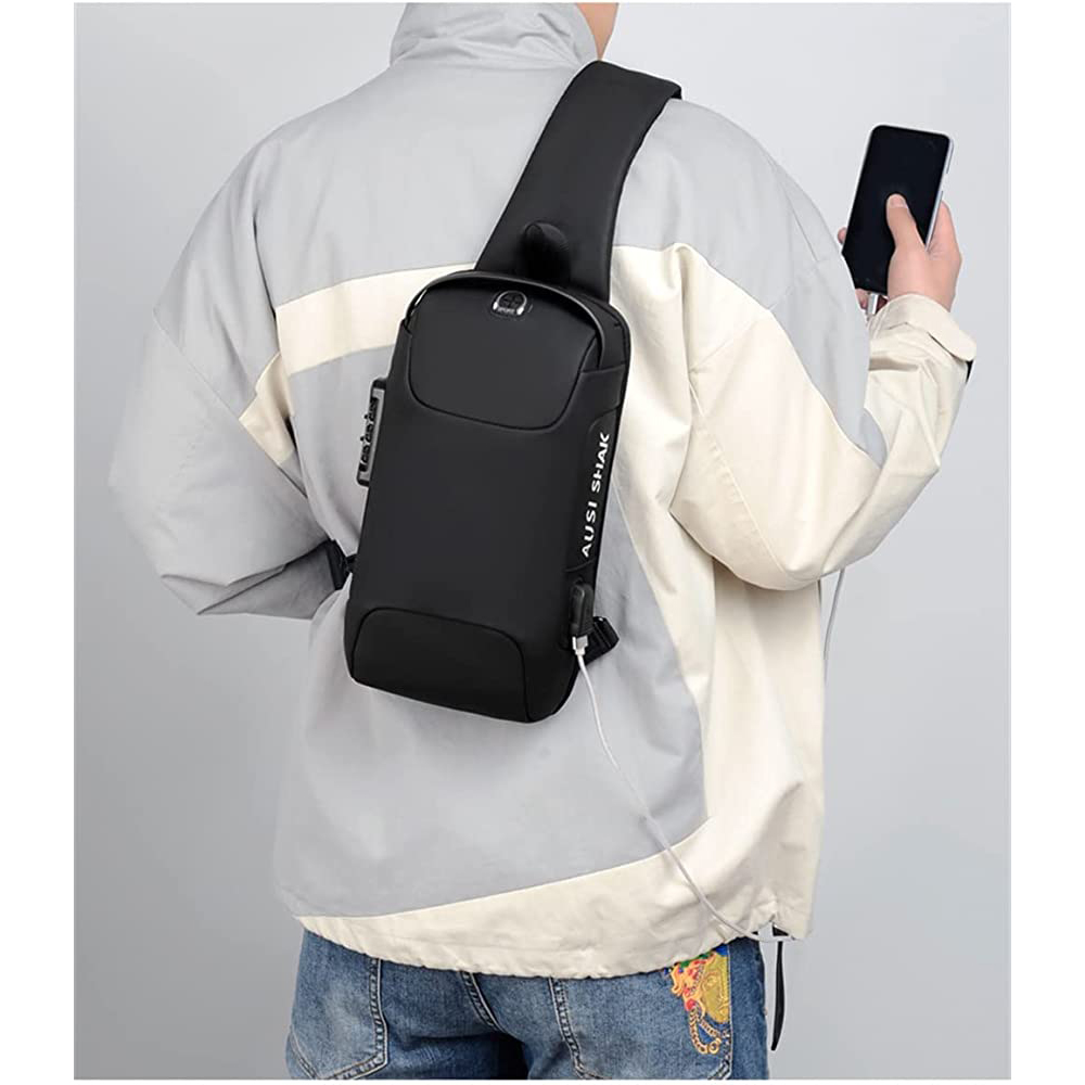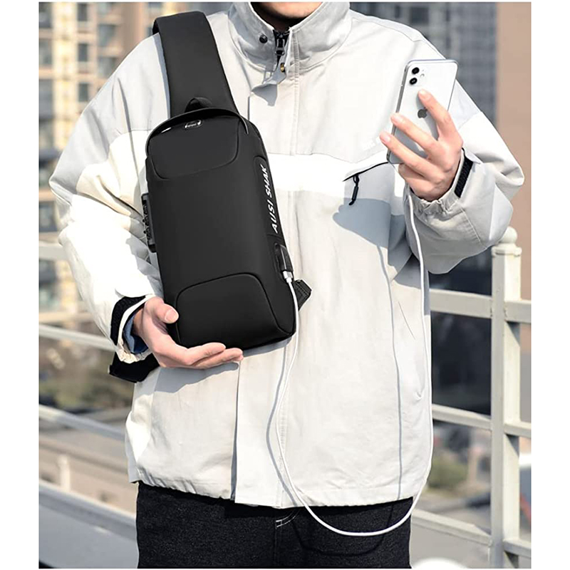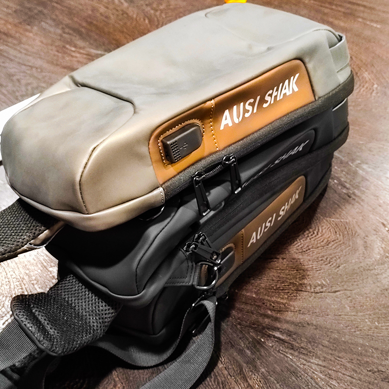 این کیف از جنس پلاستیک و بسیار سبک و خوش دست ساخته شده و دارای مقاومت مناسبی در برابر آب می باشد، لازم به ذکر است که نحوه قرار گیری این کیف روی بدن به صورت کراس بادی بوده و در جلو و یا پشت بدن قرار می گیرد که هنگام استفاده حس خوبی را به شما منتقل می کند . نقطه مثبت این کیف قفل رمز دار آن که می باشد که به وسیله آن می توانید رمز 3 رقمی تعیین کرده و زیپ ها را در صورت تمایل داخۀ آن قرار دهید. همچنین هنگام باز و بسته کردن زیپ کیف رمز دار کراس بادی Ausi Shak ، کیفیت بالای ساخت آن نمایان می شود. از این کیف جهت حمل لوازم جانبی مانند : انواع شارژر ، پاوربانک ، فلش ، هارد اکسترنال و هندزفری می توان استفاده کرد.یکی از نقاط مثبت این کیف وجود پورت و کابل USB می باشد که از طریق آن می توانید به طور مثال گوشی خود را به پاور بانک داخل کیف متصل کرده و راحت تر از آن استفاده کنید. در آخر هم باید اشاره کرد که با توجه به وزن پایین این کیف، حمل آن به آسانی صورت گرفته و به لطف طراحی هوشمندانه ی خود وسیله های حساس و کوچک نظیر فلش مموری و رم و هندزفری ، با نظم مناسبی قرار می گیرند. این مدل کیف پوسو دارای 3 زیپ و 6 جای مختلف می باشد.