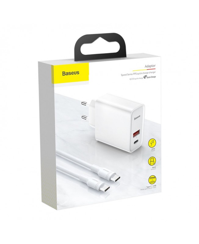 امروزه شما می توانید از طریق پاوربانک ، شارژر وایرلس و شارژر های دیواری گوشی خود را شارژ کنید اما همیشه مطمئن ترین و سریع ترین راه استفاده از شارژر های دیواری می باشد. شارژر دیواری Baseus Speedy PPS محصولی با کیفیت از کمپانی بیسوس می باشد که مجهز به فناوری Qualcomm 3.0 بوده و به شما این امکان را می دهد تا بتوانید گوشی خود را با توان 30 وات و شدت جریان 5 آمپر شارژ کنید. آداپتور شارژر Baseus CCFS-A02 از شارژ سریع کوالکام نسخه 3 نیز پشتیبانی می کند یعنی شما می توانید گوشی های خود که دارای این فناوری هستند را با سرعت بسیار بالایی شارژ کنید. جنس بدنه این محصول از پلاستیک + ABS و متریال PC بوده که از مقاومت بسیار بالایی در برابر ضربه و حرارت بر خوردار می باشد. این شارژر دارای دو پورت خروجی USB و Type-C است. هر دوی این پورت ها هم دارای قابلیت های شارژ سریع هستند. این محصول مجهز به چیپست هوشمندی می باشد که از باتری گوشی شما در مقابل نوسانات ولتاژ و اتصالات کوتاه محافظت می کند تا هیچگونه آسیبی به آن وارد نشود.ابعاد این محصول 28x52x58 میلی متر بوده که باعث شده تا بتوانید این شارژر را در هر مکانی به همراه خود داشته باشید. دو شاخه این محصول به صورت تاشو طراحی شده است و به پریز های ایران هم به صورت مستقیم متصل نمی شود و باید حتما از تبدیل برای اتصال آن به پریز استفاده بکنید. به همراه این محصول یک کابل دو سر تایپ سی قرار دارد که شارژ گوشی همراه شما را بسیار راحت تر کرده است.