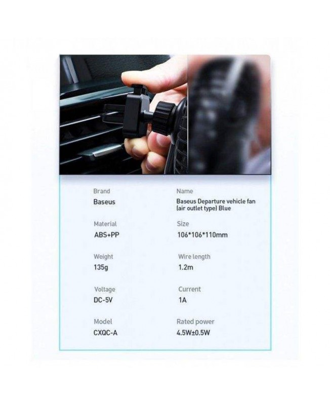 پنکه رومیزی CXQC-A Departure Vehicle Fan برند بیسوس با ابعاد 110 در قطر 106 میلی متر و وزن 135 گرم از جنس پلاستیک ABS+PP ساخته شده که در برابر ضربه و فشاور مقاوم است و علاوه بر این ویژگی صدای کمی هم در زمان روشن بود از خود ساطع می کند که باعث می شود گزینه مناسبی برای استفاده در خورو باشد.همچنین Baseus CXQC-A دارای پایه جهت نصب در دریچه کولر ماشین می باشد و می توانید آن با وزن سبکش به راحتی بر روی دریچه نصب کنید.