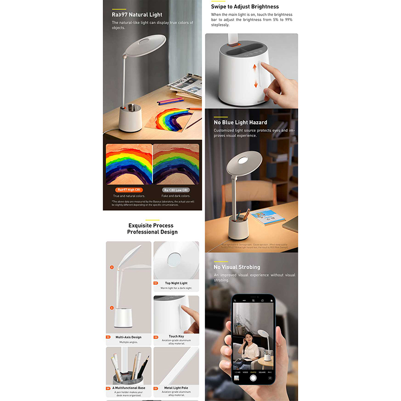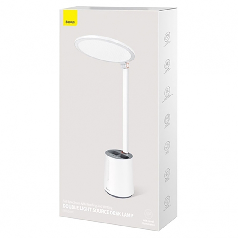 چراغ مطالعه باسئوس یک چراغ مطالعه ی معمولی نبوده و با ویژگی های خاص خود توانسته یک چراغ مطالعه ی محبوب و در عین حال با قیمت مناسب در بین کاربران باشد. مهمترین ویژگی این چراغ مطالعه توانایی تنظیم شدت نور خودکار آن بوده که به وسیله آن خود دستگاه با کمک سنسور هوشمند خود توانایی تنظیم قدرت نور با توجه به محیط را دارا می باشد. . چراغ مطالعه باسئوس Smart Eye Full DGZH-02 از 108 LED تشکیل شده که می توانید هم گرمای نور و هم شدت نور به صورت دستی و اتوماتیک تنظیم کنید.در قسمت پایینی این چراغ مطالعه بیسوس محفظه ای برای قرار گیری لوازمی مانند خودکار و ماژیک در نظر گرفته شده و جلوه زیبایی می تواند به میز شما ببخشد. این چراغ مطالعه ساخته شد از آلیاژ آلومینیوم و پلاستیک ABS ساخته شده و از مقاومت بالایی برحوردار می باشد. در قسمت پایینی این چراغ مطالعه یک پد سیلیکونی جهت جلوگیری از لیز خوردن آن تعبیه شده است.