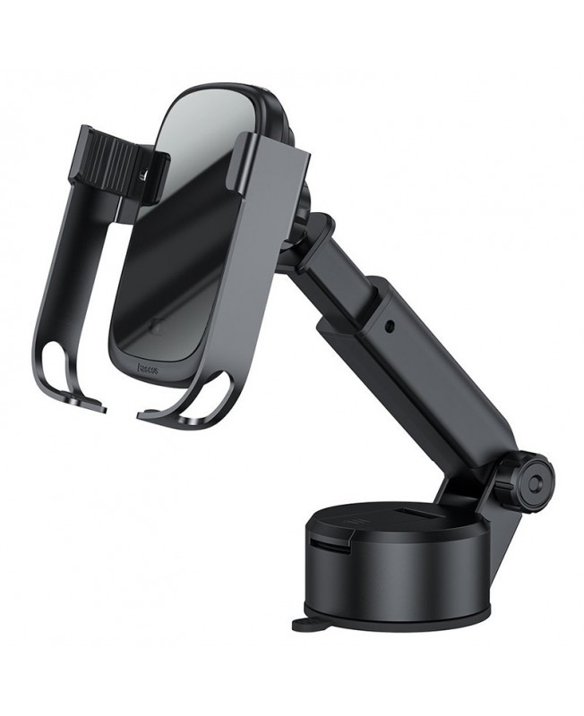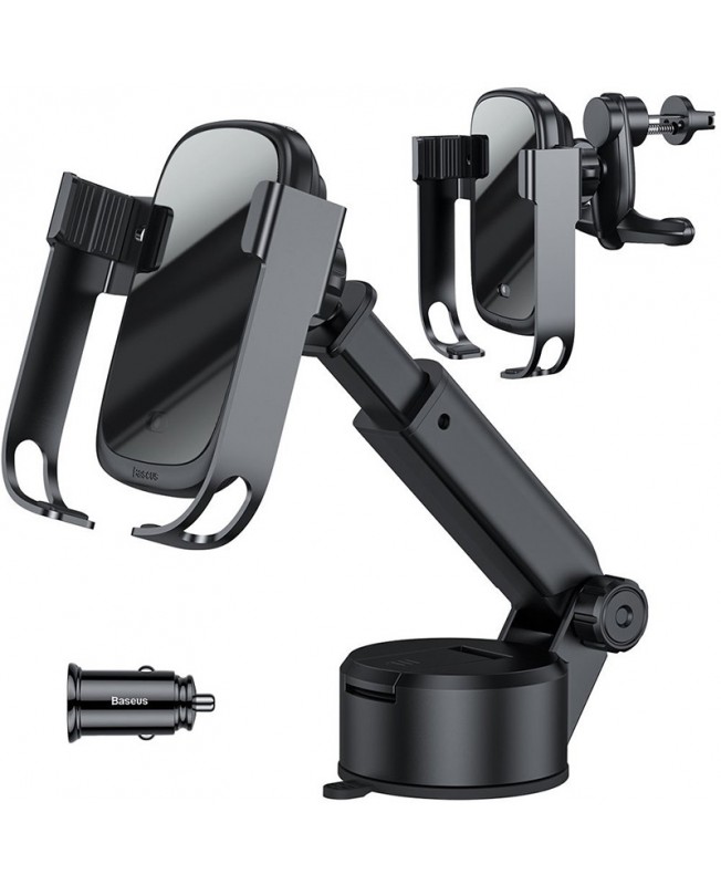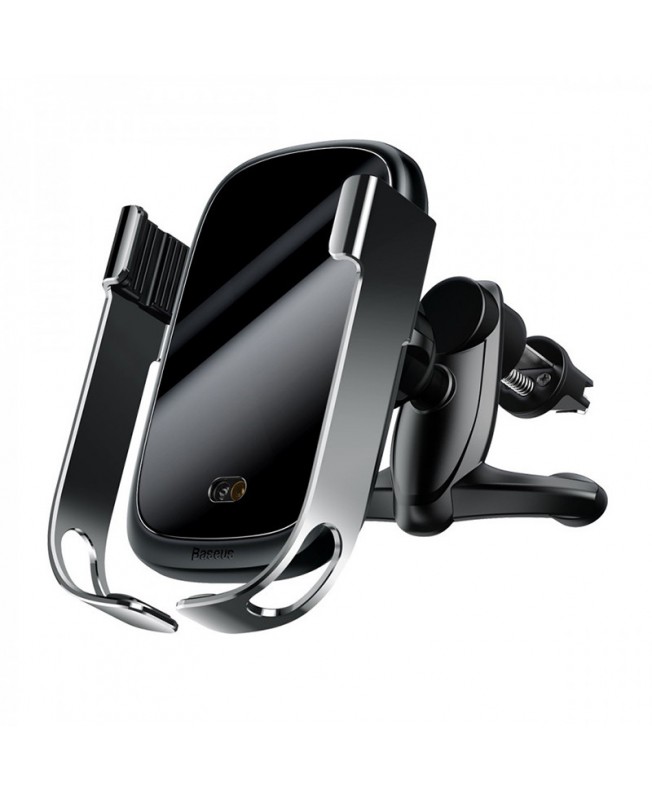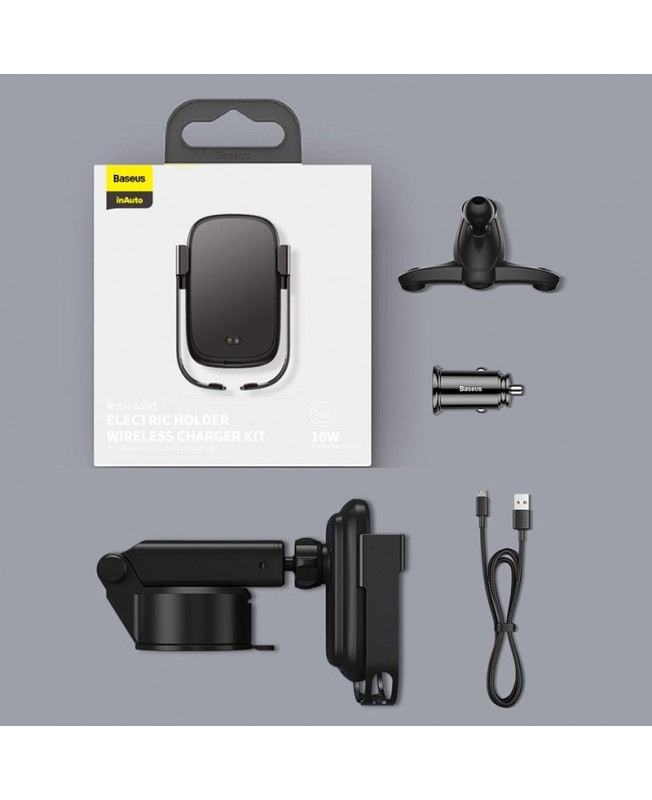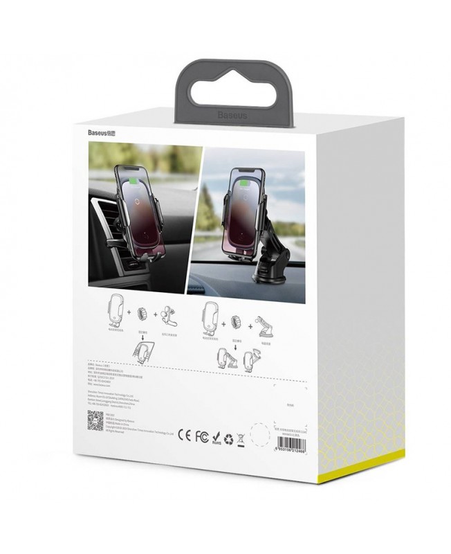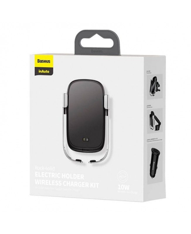 پایه نگهدارنده گوشی موبایل باسئوس مدل Rock-Solid Electric Holder Wireless Charger Kit WXHW01-B01 که به دو صورت بادکشی و دریچه کولری به خودرو شما متصل می شود و قابلیت شارژ وایرلس 10 واتی (فست شارژ) را برای شما فراهم می کند.