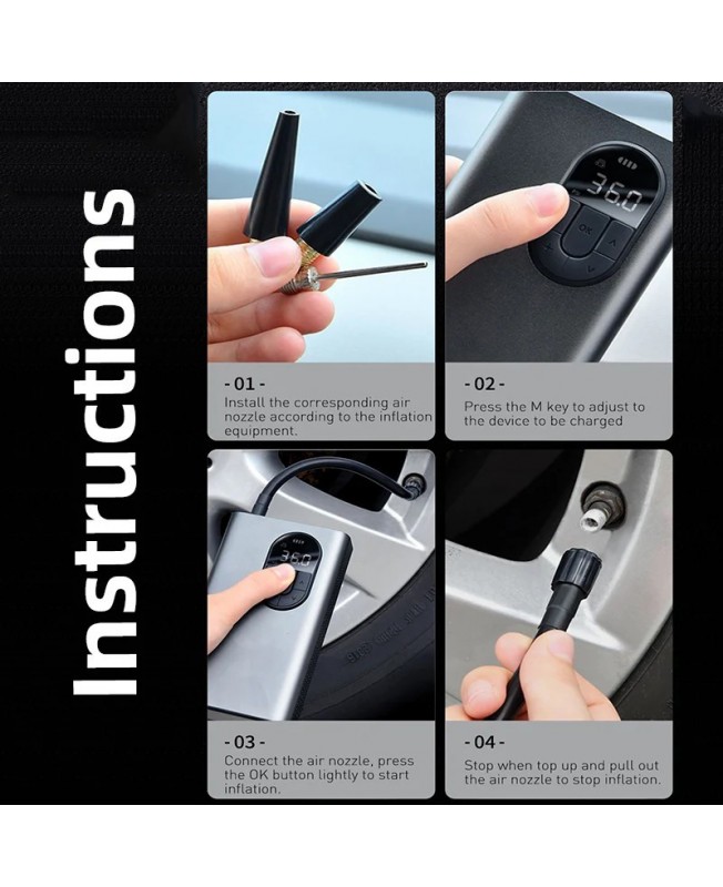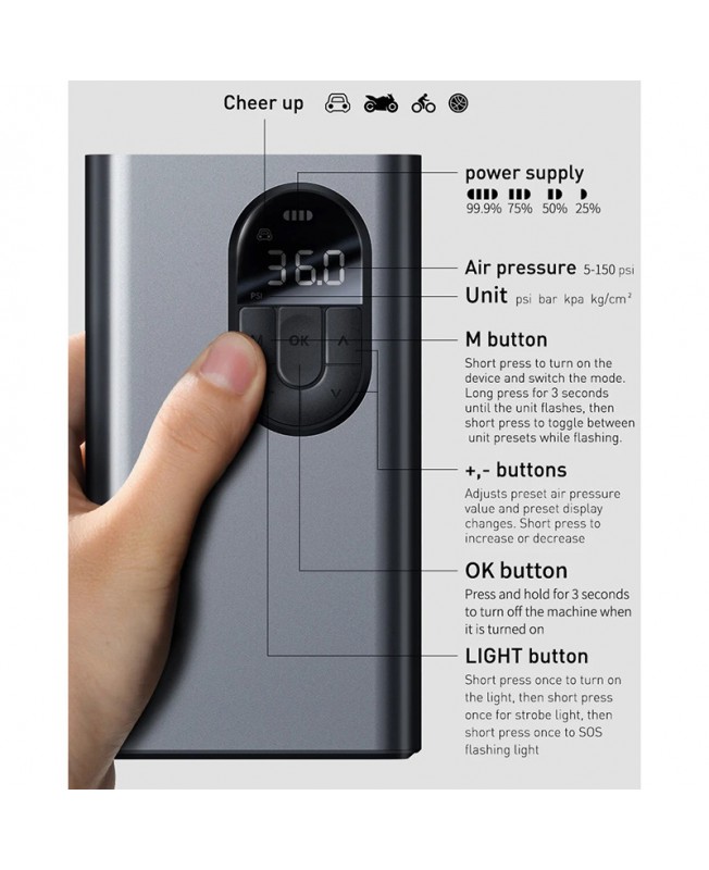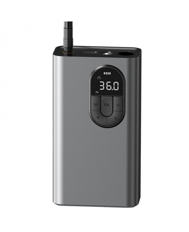 کمپرسور باد CRCQB02 برند باسئوس با ابعاد 78.2*42.6*140.2 میلی متر و وزن 610 گرم به صورت دلنشین و قابل حملی طراحی شده و به راحتی می توان این پمپ باد را حمل و در هر مکانی از آن استفاده کرد، و با شدت جریان ورودی (2.4A (max و ولتاژ ورودی 5 در دو حالت تنظیم باد خودکار و دستی توانایی باد کردن وسایل را دارد. نکته قابل توجه در مورد پمپ باد باسئوس Baseus Energy Source Inflator Pump صفحه نمایش آن است که اطلاعات لازم را در مورد فشار باد لاستیک را به شما ارائه می دهد. باتری CRCQB02 هم از جنس لیتیومی با ظرفیت 2400 میلی آمپر ساعت بوده و در 4 الی 5 ساعت به طور کامل شارژ می شود و این باتری قدرتمند می توانید برای 9 عدد تایر خودرو در حدود 4 دقیقه یا 17 تایر موتور سیکلت در حدود 2 دقیقه ، 8 تایر دوچرخه را در حدود 3 دقیقه و یا در نهایت 50 توپ بسکتبال شماره5 را در حدود 1 دقیقه استفاده شود.