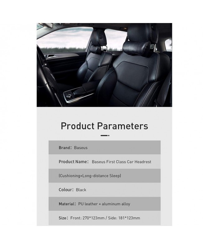 پشت گردنی First Class برند باسئوس با ابعاد 130*70*270 میلی متر و وزن 578 گرم به صورت استاندارد طراحی و تولید شده که دارای پوشش چرمی و لبه های پهن تر نسبت به وسط است و در زیر آن فومی به قطر 3 سانتی متر قرار دارد که فوم به کار رفته به خوبی فضای پشت گردن را پر میکند. و تقریبا با تمامی صندلی خودروهای موجود سازگار است و شما می توانید با استفاده از این محصول باسئوس در مسیرهاب طولانی و ترافیک که باعث خستگی و ناراحتی گردن شما می شود استفاده کنید. Baseus First Class Car Headrest با وجود 2 شیار به میله های پشت صندلی که برای سهولت در نصب یکی از شیارها بصورت فنری طراحی شده است متصل می شود و با فشردن آن میتوان بدون نیاز به خارج کردن پشت صندلی Fclass را نصب کنید. همچنین از مزیت های پشت گردنی صندلی خودرو باسئوس تنظیم ارتفاع میله و لبه ها می باشد و فاصله محل نصب تا قرار گیری سر حدود 3 سانتی متر قابلیت فنری دارد.