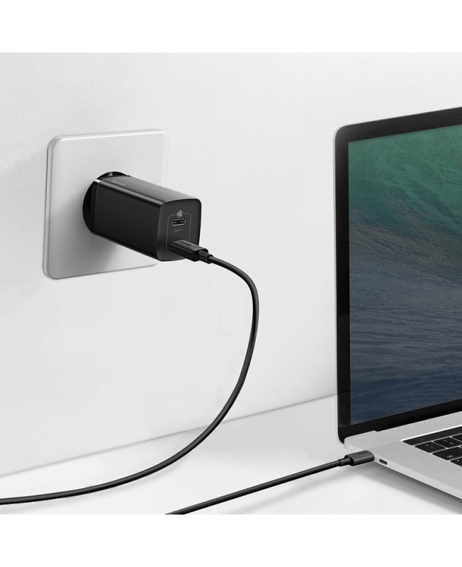 وال دیواری CCGAN65CE برند باسئوس با ابعاد 30*35*99 میلی متر و وزن 110 گرم دارای دو پورت خروجی Type-c با حداکثر توان 65W می باشد که می تواند به طور همزمان دو دستگاه را شارژ نمایید و اگر این محصول را به صورت مستقیم و به کمک دو شاخه طراحی شده بر روی آن به پریز برق متصل کنید خروجی حداکثری معادل 20V=2.25A و توان خروجی آن نیز 30W+30W خواهد بود. شارژر باسئوس GaN lite دارای قابلیت شارژ سریع ، توزیع برق هوشمند و سرعت شارژ با حداکثر توان 45 واتی است.