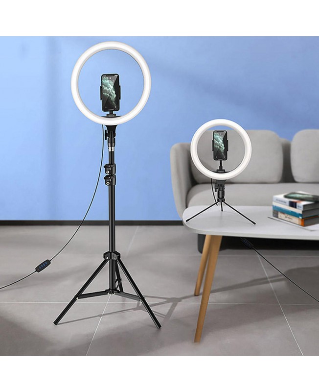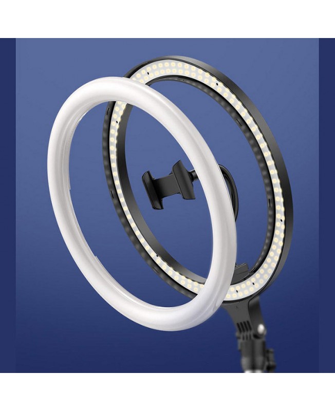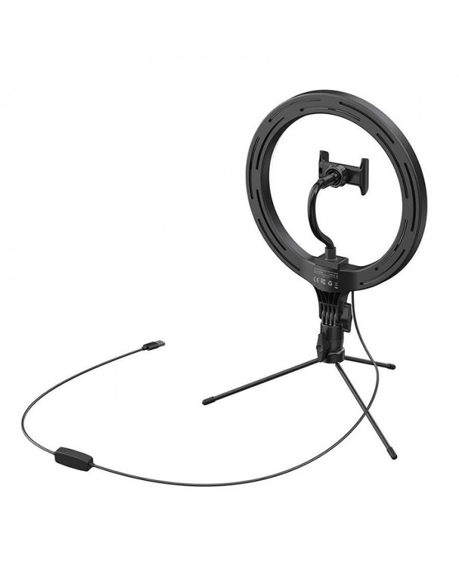 رینگ لایت CRZB10-A01 برند باسئوس با چراغی با توان 15 وات دارای اندازه 10 اینچی و 120 عدد LED (60 چراغ سفید و 60 چراغ آفتابی) با شدت روشنایی 1200 لومن می باشد که قابلیت تنظیم نور در دو حالت سرد و گرم را دارا است و از آن می توان جهت گرفتن عکسهای سلفی زیبا، سالنهای آرایشی، عکاسان، کلینیکها و تقریبا برای همه افراد درگیر در هنر عکس و فیلم ، و به خصوص واینر های فعال در شبکه های اجتماعی استفاده کرد. رینگ لایت پایه دار Live Stream مجهز به سه پایه با قابلیت تنظیم ارتفاع و زاویه های مختلف می باشد که پایهی محکم و ضد لغزش آن می توانید بدون هیچ گونه لرزشی جهت ثبت تصاویری شفاف و باکیفیت مورد استفاده قرار گیرد و از طریق کابلی یک سره ای که بر روی آن طراحی شده به برق متصل شوید و برای کنترل لامپ ها هم یک کلید بر روی کابل تعبیه شده است، البته ذکر این نکته هم حائز اهمیت می باشد که همراه این رینگ لایت یک نگهدارنده گوشی موبایل، مناسب اکثر گوشیهای هوشمند با عرض 6 تا 7.5 سانتی متر است.