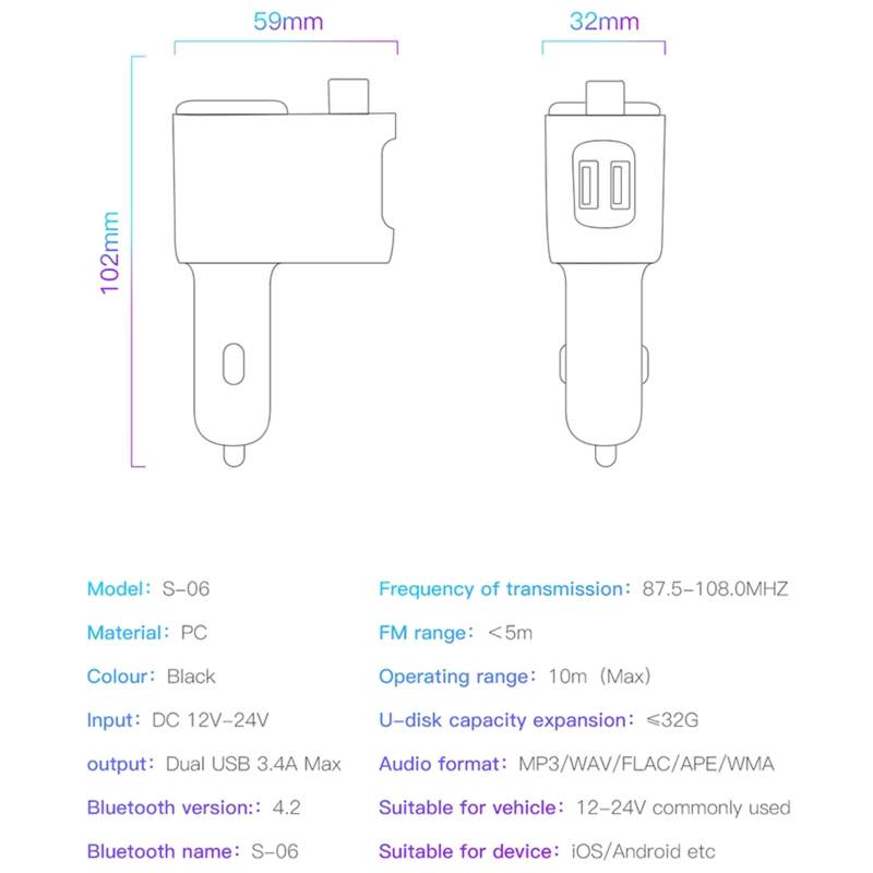 جنس این کالا از PC بوده و ولتاژ ورودی مناسب برای آن DC12V-24V می باشد. هر کدام از درگاه های USB آن این امکان را دارند که دستگاه های شما با جریان تا حداکثر 3.4 آمپر شارز کنند. فرکانس این محصول از 87.5MHz تا 108.0MHz است و بردی 5 متری دارد. همچنین این شارژر فندکی برای فلش های 32 گیگ و کم تر مناسب می باشد.