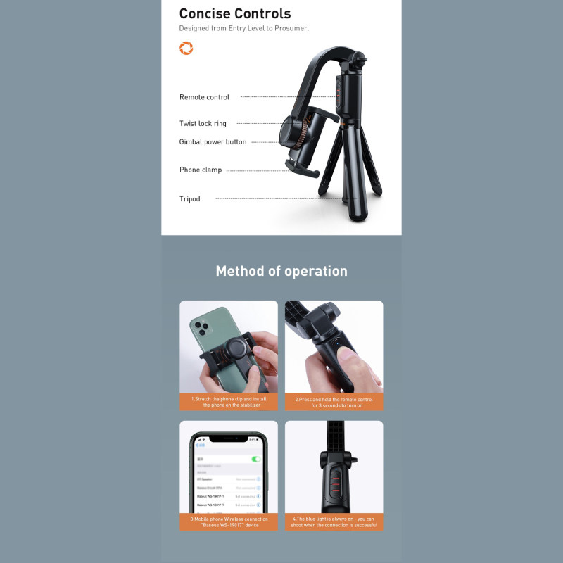 این مونوپاد تا شو است و دارای وزن 235 گرم می باشد که مناسب برای جابجایی راحت است، جنس این مونوپاد و سه پایه از آلیاژ آلومینیوم و ABS و PC می باشد که مقاومت بالایی دارد. این محصول دارای یک ریموت کنترل است که بالای پایه محصول قرار دارد که زمان کارکرد آن بعد از شارژ شدن 8 ساعت است و ظرفیت باتری این ریموت کنترل 65 میلی آمپر ساعت می باشد و همین طور تحت عنوان گیمبال بعد از شارژ شدن 3 ساعت کار می کند که باتری گیمبال آن ظرفیت 450 میلی آمپر ساعتی دارد. این محصول مناسب برای گوشی های با 6.5 اینچ (کمتر از 100 میلی متر) می باشد.