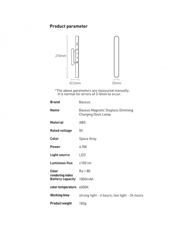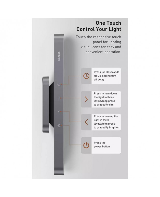 چراغ DGXC-C0G برند باسئوس دارای ابعاد 42.5*35*247 میلی متر با وزن 183 گرم از بدنه ای با جنس پلاستیک ABS با کیفیت ساخته شده که همین متریال باعث می شود تا در برابر خراش و ضربه تا حدود قابل قبولی مقاومت داشته باشد.نحوه کار Baseus Magnetic Charging Desk Lamp نیز به این صورت است که ابتدا باید پایه چسبی این محصول که در بسته بندی قرار داده شده است را به مکان مورد نظر بچسبانید و سپس لامپ را به کمک آهنربای کار شده در آن به پایه متصل کنید ، همچنین هر وقت که بخواهید هم می تواند لامپ را جدا کرده و به هر صورت که دوس دارد از آن استفاده کنید زیرا DGXC-C0G دارای یک باطری 1800 میلی آمپر ساعتی است که می تواند مدت زمان استفاده 24 ساعت در حالت کم نور و 4 ساعت در حالت پر نور را برای کاربران فراهم کند.در آخر هم باید گفت که چراغ مطالعه باسئوس دارای چهار کنترلر های لمسی می باشد که یکی از آنها برای روشن/خاموش کردن محصول ، دو تای آن برای افزایش و کاهش قدرت لامپ (چهار حالت %10 ، %50 و %100) و یک تایمر که با لمس آن چراغ در کمترین حالت نوری ممکن قرار می گیرد و پس از 30 ثانیه خاموش می شود وجود دارد.