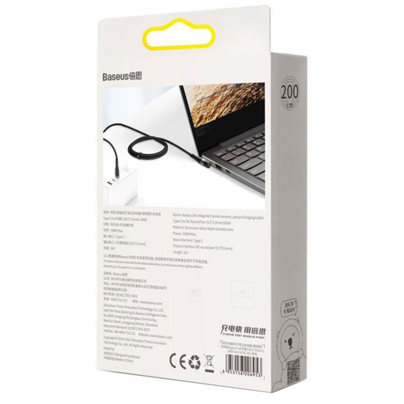 کابل شارژ مگنتی Baseus که به دلیل ویژگی مغناطیسی که دارد مقاومت بیشتری دارد، کابلی است که سمت آن به صورت USB-C است که مناسب برای اتصال به آداپتور های همخان با لپتاپ مورد نظر شما است و سمت دیگر آن به صورت سری گرد یا سوزنی DC با ابعاد 5.5*2.5 میلی متر می باشد. طول این محصول 200 سانتی سانتی متر بوده و می تواند تا حداکثر توان 100 وات را انتقال دهد. همچنین این محصول از جنس آلیاژ آلومینیوم و نایلون بافته شده می باشد.