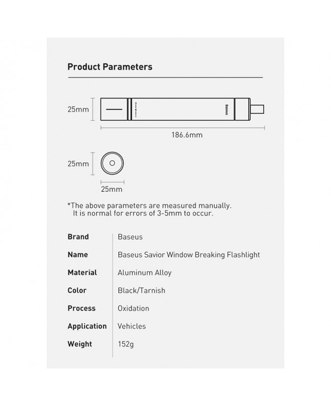 چراغ و چکش اضطراری خودرو CRSFH-B01 برند باسئوس دارای طول 18 سانتی متر با وزن 152 گرم می باشد و به شکل یک استوانه از جنس آلومینیوم طراحی شده که با وجود ابعاد کوچک و حجم کم آن می توانید به راحتی آن را جابجا و یا با پایه چسبی آن را به بدنه خودرو متصل کنید، این چکش اضطراری دارای دو قابلیت مهم می باشد که ویژگی اصلی آن چکش اضطراری است و قابلیت دیگر آن چراغ قوه قوی با برد 50 متر است که بر یک طرف آن طراحی شده ؛ چکش CRSFH-0G در موقعیت هایی نظیر آتش سوزی خودرو، تصادف ، فرورفتن اتومبیل در آب و موقیت های اینگونه که مجبورید سریعا از خودرو خارج شوید و به علت فشار آب یا ذوب شدن بخش هایی از بدنه خودرو نمی توانید درب را باز کنید به کار می آید و با خلاص شدن ضامن خود می تواند در عرض یک ثانیه فشاری معادل با 6 کیلوگرم را به شیشه وارد کند و شیشه را بشکند، طرف چراغ Baseus Sharp Tool Safety Hammer CRSFH-0G نیز که در قسمت پایینی قرار گرفته و با کمک یه باتری 220 میلی آمپر ساعتی روشنایی می دهد و پس از اتمام شارژ می توانید با استفاده از کابل Type-c موجود در بسته بندی آن را شارژ کنید. در آخر نیز باید به این نکته اشاره کرد که شکستن شیشه های عقب و جلو با چکش اضطراری خودرو باسئوس تقریبا غیرممکن است زیرا شیشه های عقب و جلو ضدانفجار هستند.