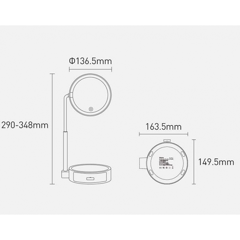 آینه آرایشی رومیزی باسئوس دارای شدت روشنایی 50 لومن می باشد. این محصول آینه ای گرد دارد که شامل 36 لامپ LED به رنگ سفید مهتابی با دمای 4000 کلوین می باشد که باعث می شود، روشنایی مناسبی ارائه شودکه باعث زیبایی محصول نیز شده است، ابعاد این محصول 16.3*15*29 سانتی متر می باشد و همین طور وزن آن 380 گرم است، لازم به ذکر است که این آینه یک جعبه کشویی دارد که می توان برخی وسایل کوچک را درون آن گذاشت و این جعبه پایه محصول نیز هست، آینه با کیفیت HD این محصول در اندازه 4.5 اینچ(11.43 سانتی متر) است که به خوبی و کامل صورت را پوشش میدهد، ارتفاع این محصول قابل تنظیم، و بین 19 تا 25 سانتی متر است که بتواند تنظیم درست آینه برای دیدن نقاط مختلف صورت را آسان کند.