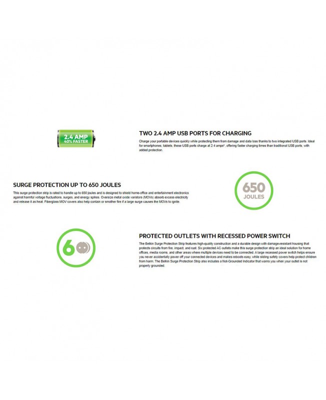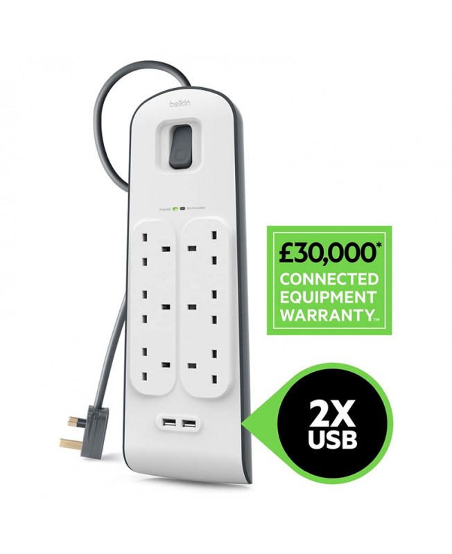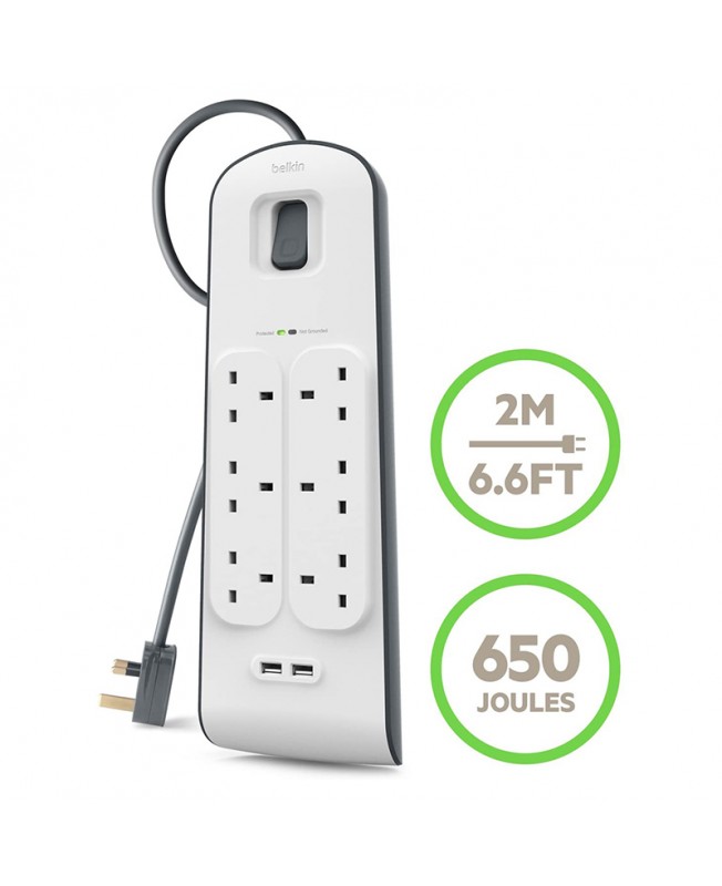 چند راهی برق 2 متری بلکین با 6 عدد پریز و 2 درگاه USB برای شارژ وسایل شما که علاوه بر دارا بودن 8 درگاه خروجی از قابلیت جلوگیری از خطر بار نیز بهره مند است که می تواند از آتش سوزی ها جلوگیری کند.