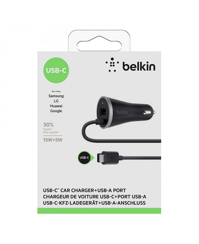 شارژر فندکی بلکین مدل F7U006BT04 با 20 وات توان خروجی یک کابل 1.2 متری Type-C متصل به خود و یک درگاه خروجی USB دارد.