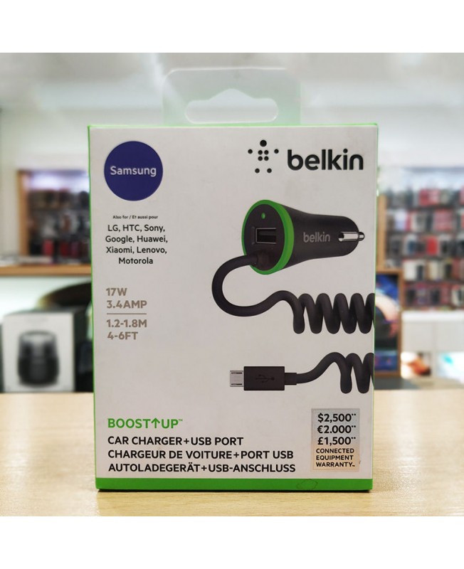 شارژر فندکی بلکین مدل F8M890BT04 با 17 وات توان خروجی یک کابل 1.8 متری Micro USB متصل به خود و یک درگاه خروجی USB دارد.
