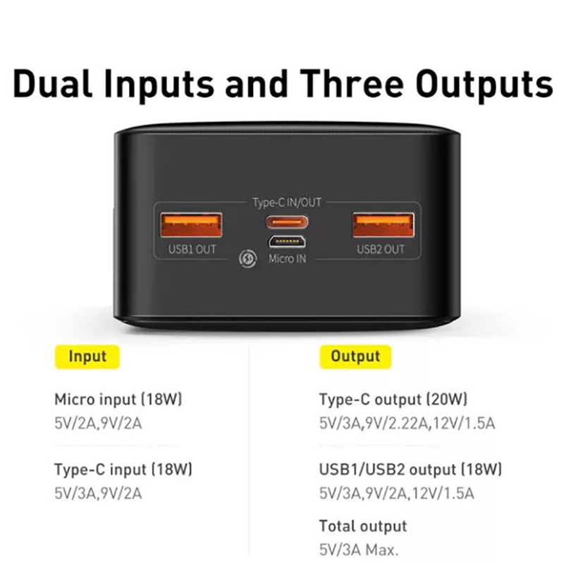 پاوربانک محصولی پرطرفدار و کاربردی می باشد اما انتخاب پاور بانکی که مناسب با نیاز ما باشد گاهی دشوار است برای همین در هنگام انتخاب پاوربانک باید علاوه بر در نظر گرفتن ظرفیت آن به تعداد درگاه های آن نیز توجه کنیم، باسئوس با پاوربانک 30000 Bipow Digital Display Power Bank که دارای توان حد اکثری 20 وات می باشد نیاز ما به پاوربانکی قدرتمند که درگاه های متنوعی دارد را برطرف کرده است. این دستگاه دارای سه درگاه خروجی می باشد که شامل دو درگاه USB که دارای ولتاژ و شدت جریان خروجی 5V/3A,9V/2A,12V/1.5A برای شارژ گوشی می باشد و همینطور دارای یک درگاه Type-C با شدت جریان و ولتاژ خروجی 5V/3A,9V/2.22A,12V/1.5A می باشد که هم درگاه خروجی است و هم ورودی، اگر چند دستگاه را به صورت همزمان به این پاوربانک وصل کنید این خروجی ها بین آن ها تقسیم می شود لازم به ذکر می باشد که شدتخروجی کلی این محصول 5V/3A است.این پاوربانک دارای دو درگاه ورودی برای شارژ کردن این کالا می باشد که یکی همان درگاه Type-c است با شدت جریان و ولتاژ 5V/3A,9V/2A و درگاه ورودی دیگر Micro USB است که جریان و ولتاژ آن 5V/2A,9V/2A می باشد.