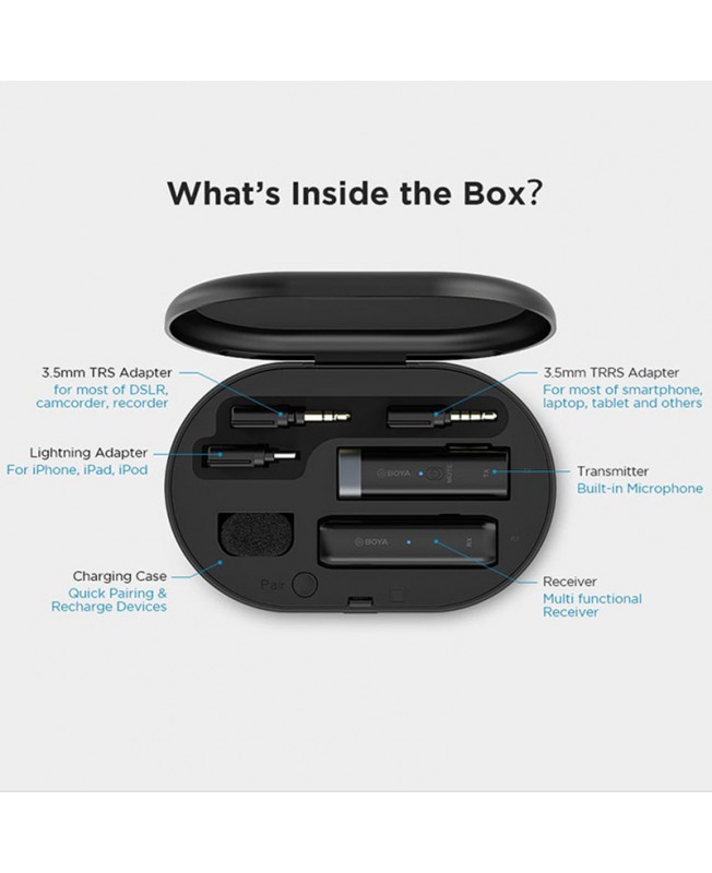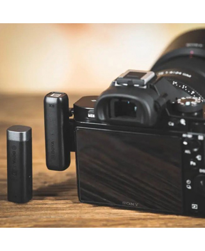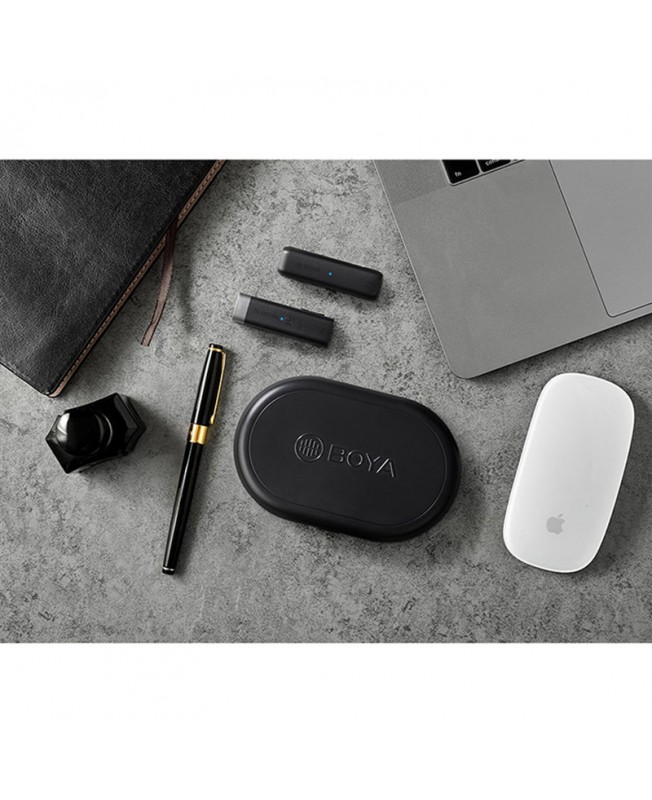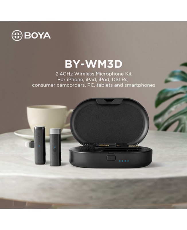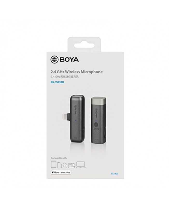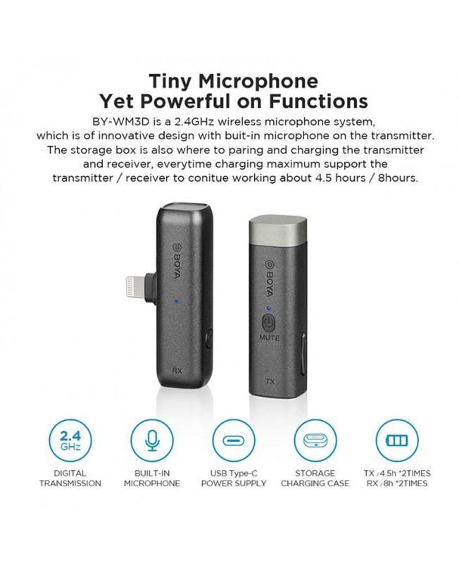 میکروفون بیسیم 2.4 گیگا هرتز BY-WM3D برند بویا مخصوص استفاده در گوشی هایی با پورت لایتنینگ و AUX با برد 60 متر طراحی شده است ، به این صورت که ریسیور یا گیرنده این میکروفون با ابعاد 18*51.8*15.6 میلی متر و وزن 10.5 گرمی دارای سری قابل تعویض می باشد و باید آن را درون درگاه گوشی تلفن قرار دهید و سپس آن را به دستگاه فرستنده که دارای ابعاد 18*51.8*15.6 میلی متر و وزن 10.5 گرم است متصل کنید تا بتوانید به ضبط صدا به صورت وایرلس بپردازید. WM3D مجهز به فیلتر نرم کننده صدا ، فیلتر برش فرکانس های پایین و سیستم ضد تداخل است که باعث می شود کیفیت و شفافیت قابل قبولی در ضبط صدا داشته باشد.نکات دیگر مورد توجه آن است که به دلیل حجم و وزن کم و طراحی مخصوص آن می توان به راحتی آن را حمل کرد و بر روی دستگاه فرستنده نیز دکمه ای برای روشن و خاموش و جفت سازی با گیرنده وجود دارد؛ نوع استفاده این محصول هم به صورت شارژی می باشد و شرکت بویا یک کیس شارژ مانند کیس هدفون ها درون بسته بندی آن قرار داده و کاربران می توانند با یک بار شارژ کامل آن برای 4.5 ساعت از فرستنده و 8 ساعت از گیرنده استفاده کنند ، همچنین با کیس شارژ می توان دو بار به طور کامل این میکروفون را شارژ کرد و جهت شارژ کیس هم باید از یک کابل تایپ سی بهره برد.