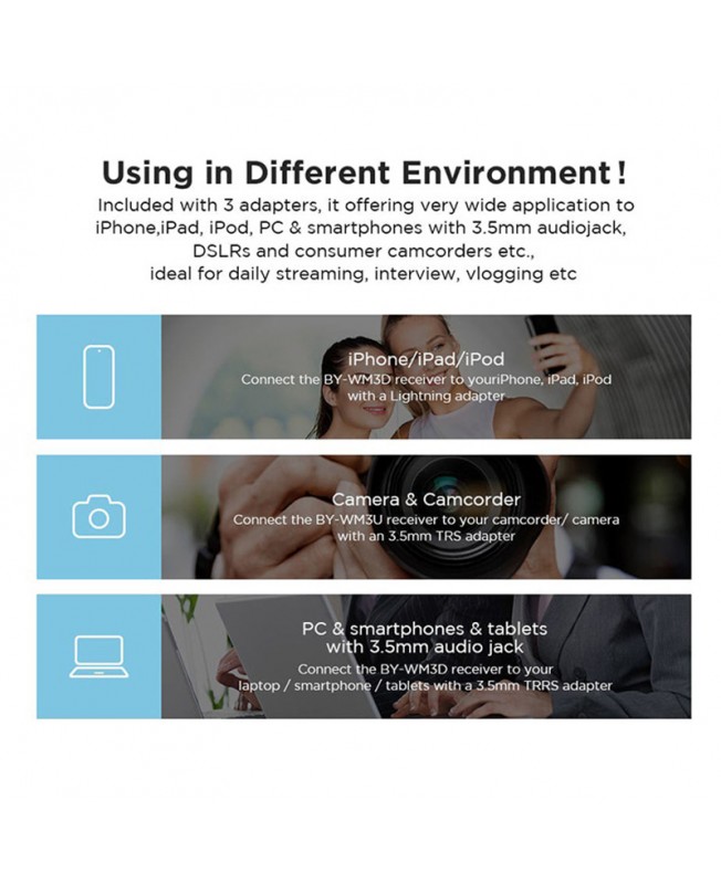 میکروفون بویا با حساسیت 90dB+/- 3dB- دارای قطبیت omni directional می باشد و می تواند صدا را از اطراف به خوبی دریافت و به وضوح ثبت کند که این قابلیت میکروفون بویا را برای مصاحبه، ضبط ویدیو و ... مناسب می سازد.در آخر هم باید اشاره کرد که گیرنده WM3D توانایی تعویض سری را به کمک سه سری (لایتنینگ ، جک 3.5 میلی متری صدا "TRRS" و جک 3.5 میلی متری صدا "TRS" ) دارد که این امکان را برای کاربران به وجود می آورد تا بتوانند این میکروفون را به دستگاه هایی نظیر گوشی ، تبلت ، دوربین ، کامپیوتر و .... متصل کنند.