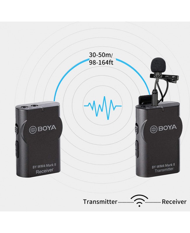 میکروفون بی سیم بویا BY-WM4 Mark II از سیستم میکروفن بی سیم 2.4 گیگاهرتزی در ضبط صدای زنده بهره می برد که با توجه به این قابلیت می توان برای کاربرد خبرنگاری، تولید محتوا ، کنفرانس ها و … مورد استفاده قرار گیرد.