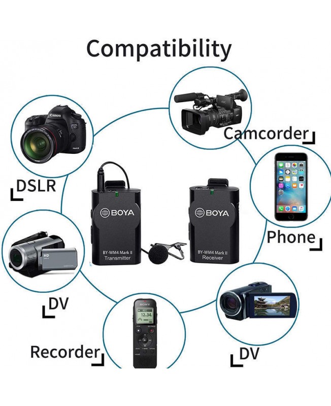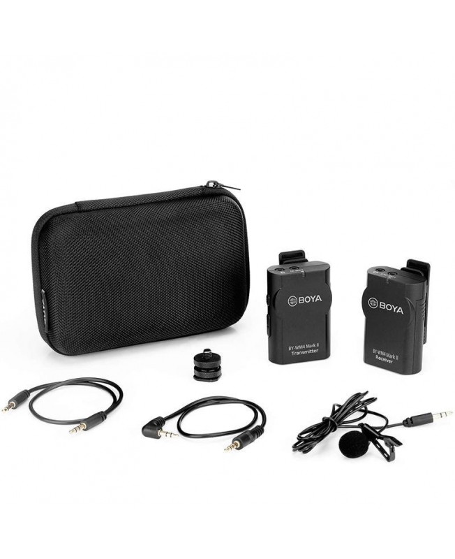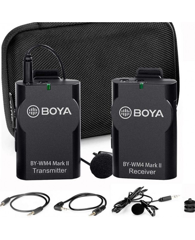 میکروفون بیسیم 2.4 گیگا هرتز BY-WM4 Mark II برند بویا با تمام گوشی های هوشمند ،دوربین های DSLR و دوربین های فیلم برداری و.. سازگار می باشد. BY-WM4 مجهز به فیلتر نرم کننده ی صدا ، فیلتر برش فرکانس های پایین و همچنین سیستم قابلیت ضد تداخلی است که با تمامی این ویژگی ها کیفیت صدای ضبط شده شما به مقدار قابل قبولی افرایش می یابد.میکروفون بی سیم بویا شامل یک دستگاه گیرنده و یک فرستنده است که حداکثر تا فاصله 50 متری بدون مانع با اتصال wireless بدون هیچ مشکلی کار می کند و صدای شما را با بهترین کیفیت انتقال می دهد.نکته دیگر مورد توجه این است که به دلیل حجم و وزن کم و طراحی مخصوص آن می توان به راحتی آن را بر روی گوشی ، دوربین ،سه پایه و یا بر روی کمربند خود قرار داد.بر روی هر دو دستگاه گیرنده و فرستنده دکمه و نشانگر LED برای روشن و خاموش و نشان دادن وضعیت دستگاه وجود دارد. منبع تغذیه گیرنده و فرستنده میکروفون BY-WM4 Mark II توسط باتری های قلمی است و درگاه های ارتباطی به صورت جک 3.5 میلیمتری صدا و XLR می باشد و گیرنده آن دارای کابل اتصال TRRS برای اتصال به گوشی و کابل TRS برای اتصال به دوربین است.