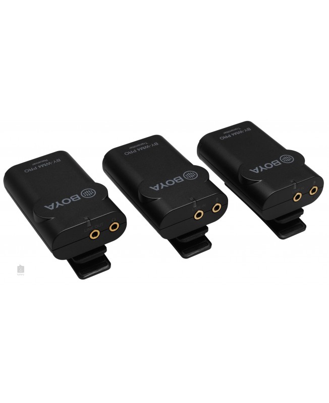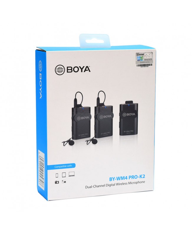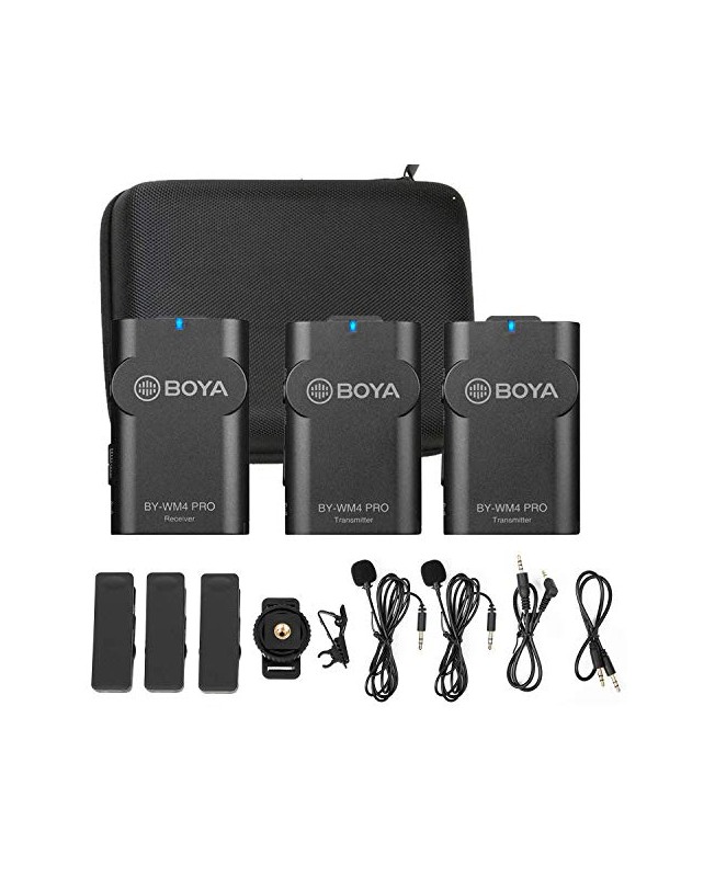 میکروفون بیسیم 2.4 گیگا هرتز BY-WM4 Pro برند بویا با جک 3.5 میلیمتری صدا به تمام گوشی های هوشمند ،دوربین های DSLR ، دوربین های فیلم برداری ، کامپیوتر و تبلت ها سازگار می باشد و می تواند تا برد 50 متر از این اتصال بی سیم پشتیبانی کند، دبلیو ام فور پرو کا تو مجهز به فیلتر نرم کننده ی صدا ، فیلتر برش فرکانس های پایین و سیستم ضد تداخل است که باعث می شود کیفیت و شفافیت قابل قبولی در ضبط صدا داشته باشد.نکته دیگر مورد توجه این است که به دلیل حجم و وزن کم و طراحی مخصوص آن می توان به راحتی آن را بر روی گوشی ، دوربین ،سه پایه و یا بر روی لباس و کمربند خود قرار داد، همچنین بر روی هر دو دستگاه گیرنده و فرستنده دکمه ای برای روشن و خاموش و تنظیم صدای وجود دارد و باید گفت که منبع تغذیه آن هم دو عدد باتری نیم قلمی است.اما نکته ایی که درباره این محصول حائز اهمیت است وجود دو فرستنده می باشد و به کاربران این امکان را فراهم می سازد تا به طور همزمان از هردو آنها استفاده نمایند و صدا را به خوبی ضبط کنند.