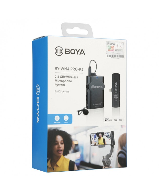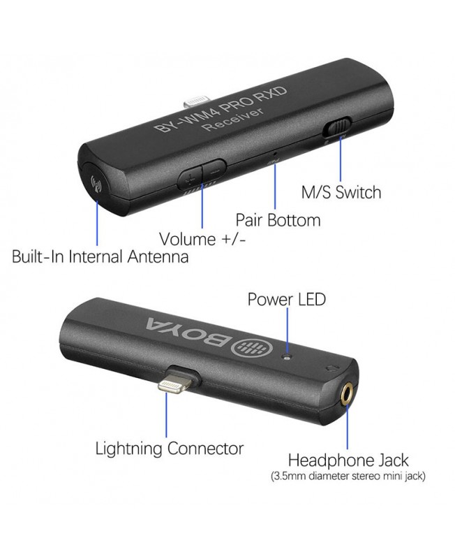 میکروفون بیسیم 2.4 گیگا هرتز BY-WM4 Pro-K3 برند بویا مخصوص استفاده در گوشی هایی با پورت لایتنینگ با برد 60 متر طراحی شده است به این صورت که ریسیور یا گیرنده این میکروفون با ابعاد 12*30.7*82 میلی متر و وزن 12 گرمی دارای سری تایپ سی می باشد و باید آن را درون درگاه گوشی تلفن قرار دهید و سپس آن را به دستگاه فرستنده که دارای ابعاد 35*70*45 میلی متر و وزن 47 گرم می باشد متصل کرده تا بتوانید به ضبط صدا به صورت وایرلس بپردازید. BY-WM4 Pro-K3 مجهز به فیلتر نرم کننده صدا ، فیلتر برش فرکانس های پایین و سیستم ضد تداخل است که باعث می شود کیفیت و شفافیت قابل قبولی در ضبط صدا داشته باشد.نکته دیگر مورد توجه این است که به دلیل حجم و وزن کم و طراحی مخصوص آن می توان به راحتی آن را حمل کرد و بر روی دستگاه فرستنده دکمه ای برای روشن و خاموش و جفت سازی با گیرنده وجود دارد ، منبع تغذیه گیرنده هم دو عدد باتری نیم قلمی می باشد.