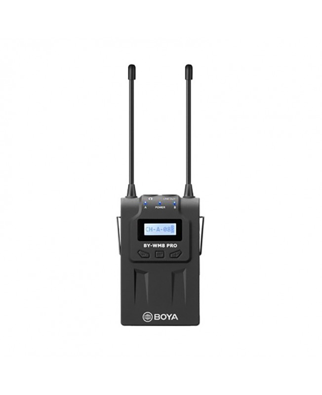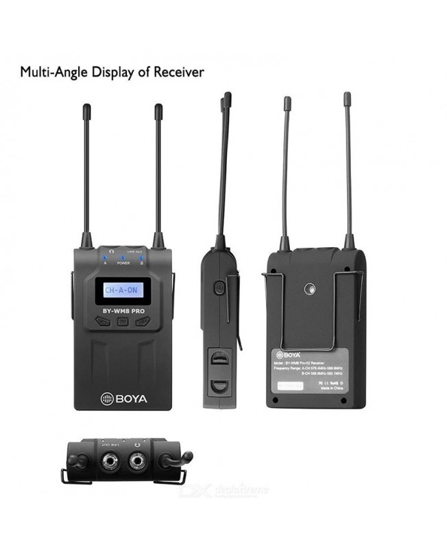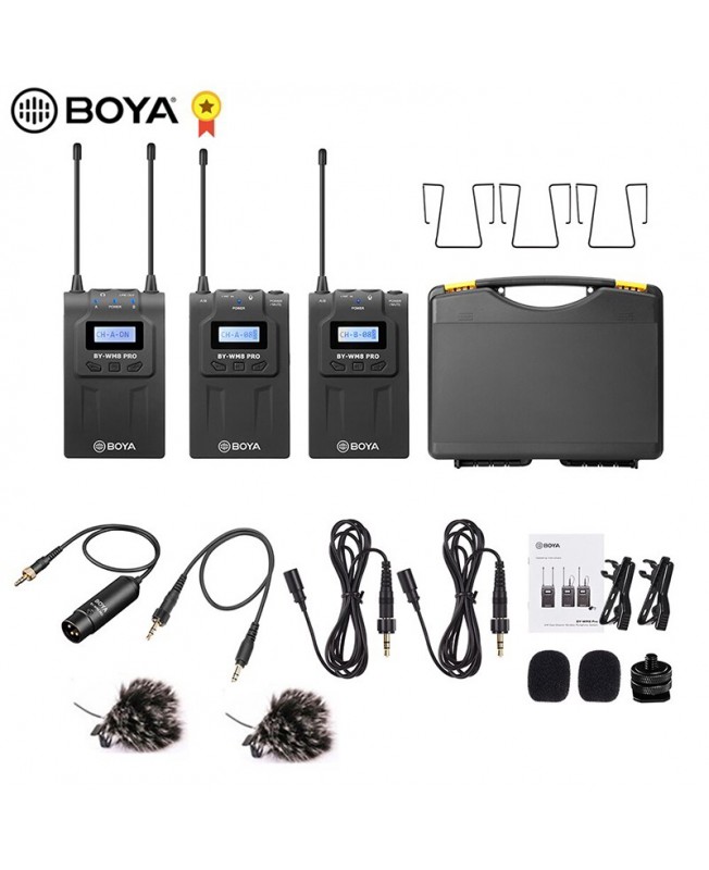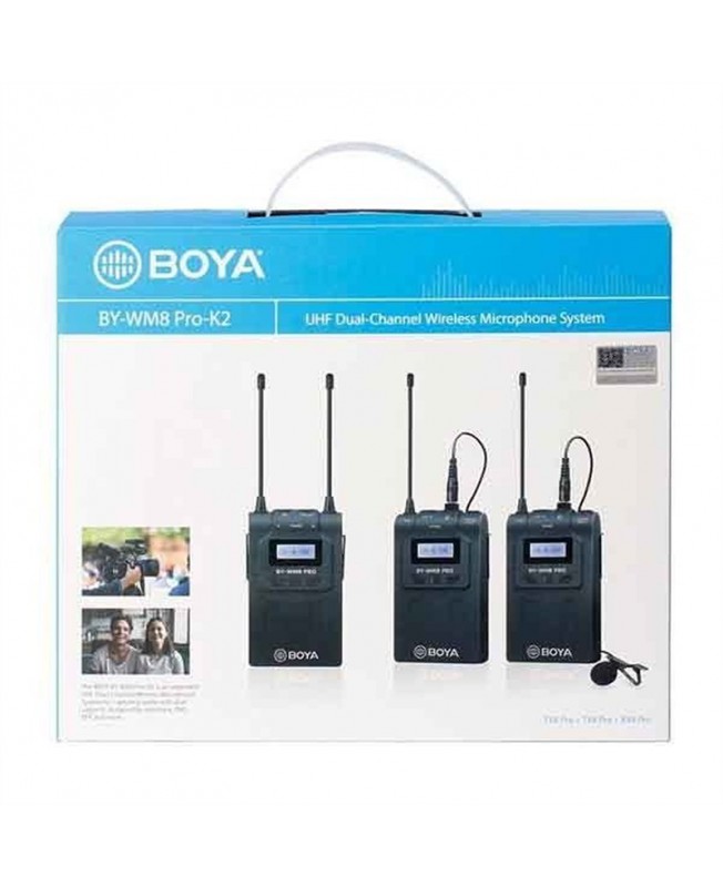 میکروفن بی سیم BY-WM8 Pro-K2 برند بویا نسخه ارتقا یافته میکروفن وایرلس UHF است و به دلیل به کارگیری میکروفن بی سیم دو کاناله ی UHF بین کاربران به نام هاش اف شناخته می شود،و برای ضبط در موقعیتهایی که دو نفره مناسب می باشد همچنین بر روی این محصول LCD برای نمایش و دکمههایی برای تنظیم موج رادیویی قرار گرفته و می توانید از میکروفن WM8 که دارای وزن کم، مصرف بهینهی باتری ، برد زیاد و استفاده از الگوی قطبی Omni-Directional یا تمام جهتی این میکروفون را محصولی بی نطیر برای برای ضبط مصاحبه، ENG، EFP، ساخت فیلم و تولید محتوا استفاده نمایید. از دیگر قابلیتهای این محصول بویا میتوان به توانایی کارکردن تا 100 متر در مدت طولانی (حدودا ۶ ساعت) اشاره کرد.همچنین روی میکروفن وایرلس بویا BY-WM8 Pro-K2 یک ورودی مخصوص میکروفن و یک ورودی مخصوص فرستنده وجود دارد و از طریق هدفون ها می توان گیرنده را مستقیماً نظارت کرد. همچنین این مدل سری کامل تر نسخه Pro-K1 می باشد که در این مدل بجای یک فرستنده می توانید صدا را از دو فرستنده به صورت همزمان دریافت کنید اما نکته ایی که می ماند این میکروفون وایرلس با گوشی تلفن همراه سازگار نمی باشد و فقط می تواند از آن برای دوربین ها و کامپیوتر های داری کارت صدای اکسترنال استفاده کنید.