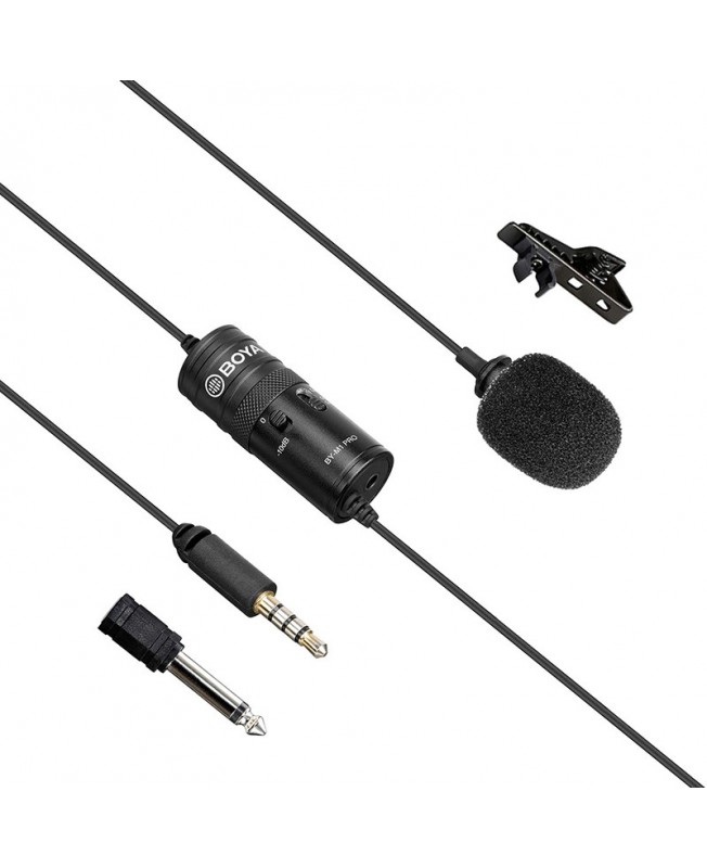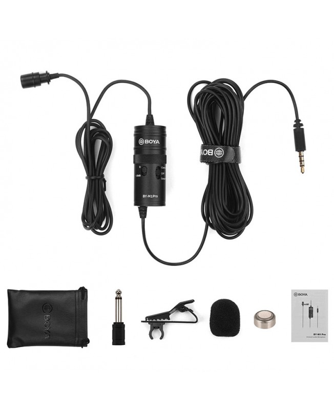 میکروفون یقه ای BY-M1 Pro برند بویا با وزن 58 گرم و طول 6 متر توسط باطری LR44 تغذیه می شود و با دهانه دیافراگم 2.1 اینچی ، پاسخگویی 70Hz~18kHz و گستره دینامیکی 78 دسیبل به بالا می تواند صدا را به بهترین شکل ممکن برای شما ضبط کند، رابط این میکروفون هم جک 3.5 میلی متری صدا است که این امکان را برای Boya BY-M1 Pro ایجاد می کند تا با دستگاهایی مثل دوربین ( برای استفاده در دوربین ها باید کلید فیزیکی بر روی بدنه را در حالت Camera گذاشت) ، کامپیوتر ، گوشی تلفن همراه و تبلت سازگار باشد.اما نکته ایی باعث جذابیت این میکروفون می شود آن است که یک ورودی 3.5 میلی متری صدا هم بر روی آن قرار داده شده است تا کاربران بتوانند صدا را مانیتورینگ کنند و بتوانند در هنگام کار کنترل بهتری در ضبط صدا داشته باشند. همچنین کمپانی بویا برای جلوگیری از نویزهای ناشی از وزش باد یک ابر خشگیر صدا در بسته بندی در کنار تبدیل درگاه خروجی ۶ میلی متری، گیره، دفترچه راهنما و کیف حمل چرمی قرار داده است.