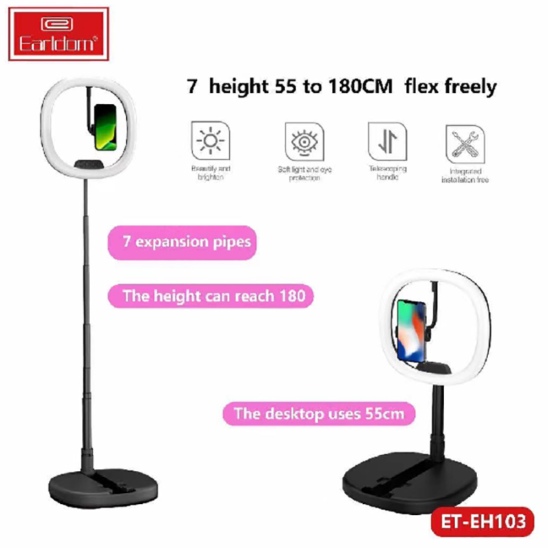 برند ارلدام یک از برند های فعال در زمینه ی لوازم جانبی موبایل بوده و حالا با عرضه ی رینگ لایت ET-EH103 به بازار ، فعالیت خود را در این زمینه گسترش داده است. رینگ لایت ارلدام Earldom ET-EH103 از جنس پلاستیک ABS بوده و ارتفاع آن تا 180 سانتی متر می رسد. طراحی این رینگ لایت به شکل تا شو بوده و در صورت نیاز به جا به جایی می توانید آن را به ابعاد کوچک 30 * 30 * 7.5 سانتی متر برسانید و به راحتی هر چه تمام تر آن را جا به جا کنید.