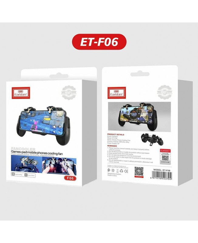 دسته بازی موبایل ارلدام مدل F06 از آلیاژ روی و پلاستیک ABS و به صورت کشویی طراحی و ساخته شده که کاربران می توانند با کشیدن دست گیره سمت راست و کشیدن آن گوشی تلفن همراه خود را درون آن قرار دهند و با دو کلید موجود در بالای آن به انجام بازی هایی نظیر PUBG و Call Of Duty بپردازند. نکته ایی که باعث جذابیت این محصول می شود وجود یک پایه نگهدارنده و یک فن در قسمت پشتی آن است که در مواقعی که با تلفن همراه در تایم های بالا به انجام بازی می پردازید به کارتان خواهد آمد و نحوه کار آن هم به این شکل می باشد که باید کابل Micro USB موجود در بسته بندی را به برق و به قسمت انتهایی ET-F06 وصل کرده و سپس دکمه روشن کردن محصول را بزنید؛ مورد آخر درباره این محصول هم آن است کخ به دلیل داشتن فضایی خالی در گیره های نگهدارنده گوشی اجازه دسترسی به پورت های تلفن همراه را به شما می دهد اما باید به این موضوع توجه داشته باشید در مواقع استفاده از پورت ها دسته بازی به خوبی درون دست قرار نمی گیرد.