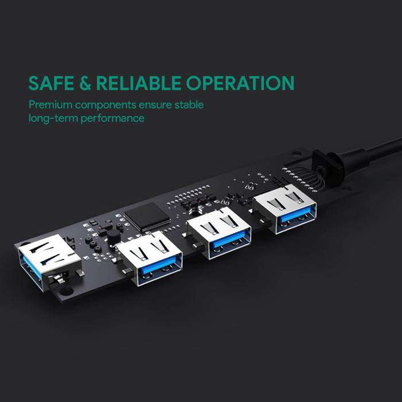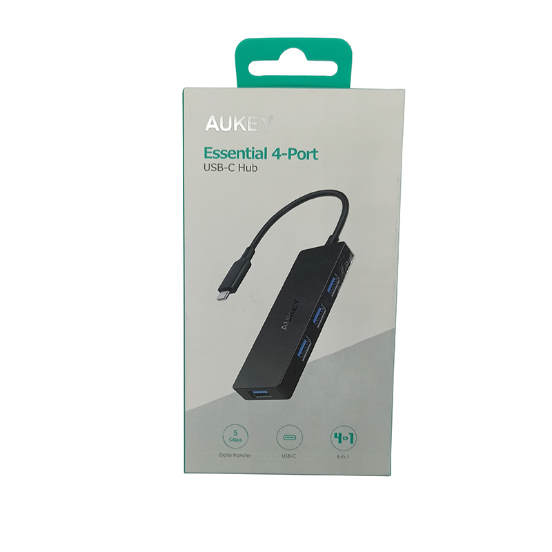 هاب Aukey Essential 4-Port USB-C Hub که 4 درگاه USB-A 3.1 که سرعت انتقال حداکثری آن ها 5Gbps است دارد و همچنین دارای یک کابل متصل به هاب که Type-C می باشد که نیاز به درگاه های USB بیشتر را برطرف کرده است همچنین لازم به ذکر است که طول کابل این کالا 20 سانتی متر می باشد.