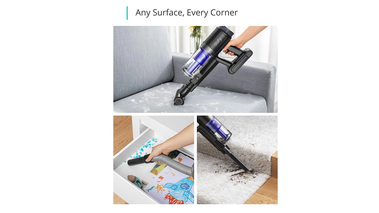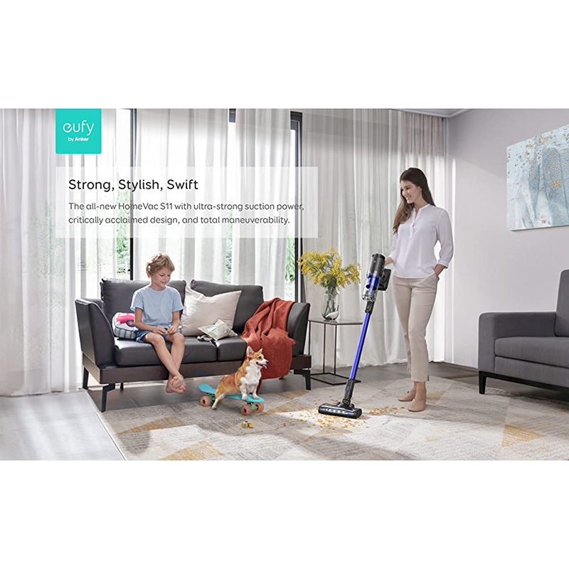 جارو شارژی یوفی Eufy HomeVac S11 Go دارای تکنولوژی dual-vortex می باشد که سبب مهار گرد و غبار و در نتیجه کاهش آلودگی هوا می شود. این جاروی بی سیم دارای دارای قدرت و ساکشن بالایی می باشد (7000 الی 20000 پاسگال) و بیشینه قدرت آن تا 120 وات هم می رسد که برای مکان هایی که نیاز به تمیز کردن عمیق تر دارند استفاده می شود. یک حالت پرکاربردی که یوفی اس 11 دارد این است که می توانید از آن برای تمیز کردن سطوحی مانند روی مبل استفاده کنید و برای استفاده از این قابلیت جارو را به حالت دستی کوچک در می آورید.