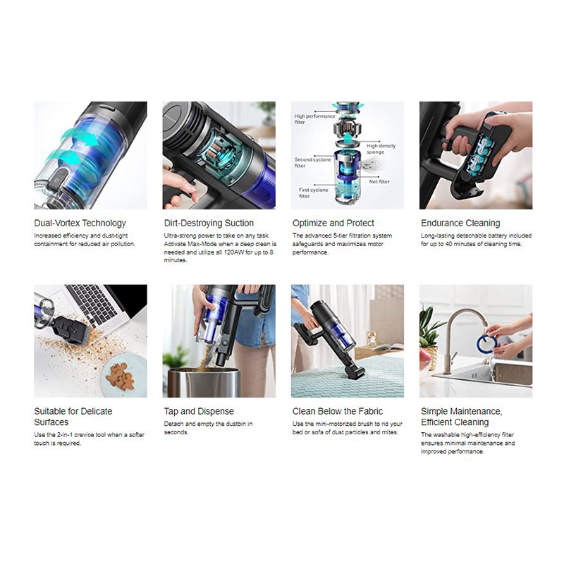 جارو شارژی یوفی Eufy HomeVac S11 Go دارای تکنولوژی dual-vortex می باشد که سبب مهار گرد و غبار و در نتیجه کاهش آلوذگی هوا می شود. این جاروی بی سیم دارای دارای قدرت و ساکشن بالایی می باشد و بیشینه قدرت آن تا 120 وات هم می رسد که برای مکان هایی که نیاز به تمیز کردن عمیق تر دارند استفاده می شود. یک حالت پرکاربردی که یوفی اس 11 دارد این است که می توانید از آن برای تمیز کردن سطوحی مانند روی مبل استفاده کنید و برای استفاده از این قابلیت جارو را به حالت دستی کوچک در میاورید. یکی از نقاط مثبت جارو شارژی یوفی Eufy HomeVac S11 Go چراغ هایی است که در جلوی آن قرار گرفته است که به وسیله ی آن می توانید مکانی را که تمیز می کنید با وضوح بالاتر دیده و تمیز کنید.