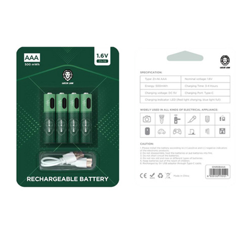 شرکت Green Lion باتری نیم قلمی قابل شارژی را تولید کرده که برای شارژ آن نیاز به دستگاه جداگانه برای شارژ ندارید و به راحتی می توانید آن را با کابل Type-c در حدود 2 ساعت فول شارژ کنید(که البته این زمان بسته به استفاده از سری مناسب متفاوت است). ابعاد و اندازه باتری GNRGBAAA دقیقا مشابه مابقی باتری های AAA موجود در بازار بده و جنس بدنه آن فلزی است؛ طول عمر بالا با سیکل 1000 بار شارژ بدون تغییر در حجم و ظرفیت باتری برابر با 500mAh را دارد. البته این اعداد اعلام شده در شرایط آزمایشگاهی بوده و می تواند در استفاده معمول کمتر یا حتی بیشتر نیز باشد. همچنین درون بسته بندی این محصول یک کابل تبدیل USB به دوسر Type-c قرار دارد که این امکان را برای کاربران فراهم می سازد تا بتوانند به طور همزمان دو باتری را شارژ نمایند.