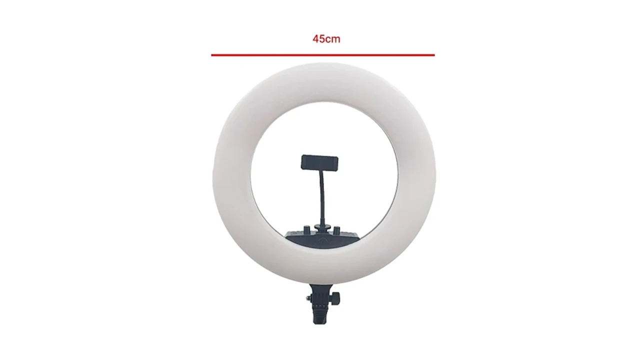 رینگ لایت هیرو مدل FE480 با قطر خارجی 45 سانتیمتر طراحی شده و از ساختاری مقاوم و سبک برخوردار است. طراحی دایرهای آن موجب میشود نور بهصورت یکنواخت روی سوژه پخش شود و سایههای مزاحم از بین بروند. پایه قابل تنظیم و سهپایهی محکم این محصول، امکان استفاده در زوایای مختلف را فراهم میکند. همچنین وجود نگهدارندهی گوشی در مرکز رینگ، کار را برای فیلمبرداری و عکاسی بسیار آسان کرده است.