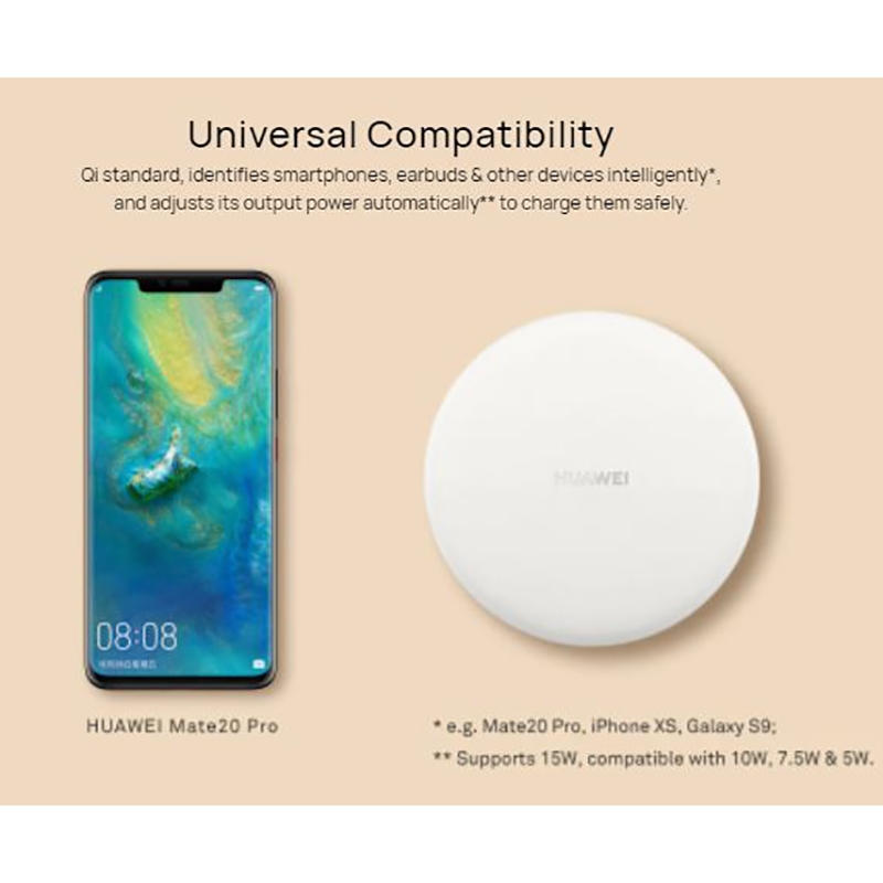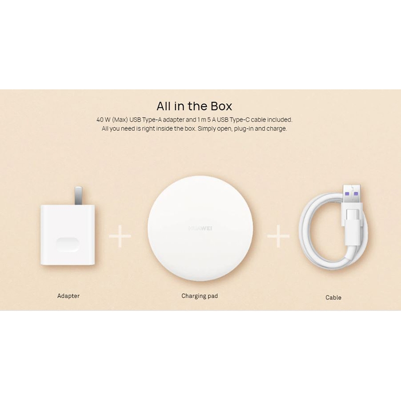شارژر وایرلس Huawei Wireless Charger CP60 مناسب برای شارژ بی سیم گوشی های دارای این ویژگی با حداکثر توان 15 وات می باشد، و لازم به ذکر است که در جعبه این محصول یک آداپتور 40 وات به همراه کابل USB به Type-C برای شارژ کردن آن نیز وجود دارد.